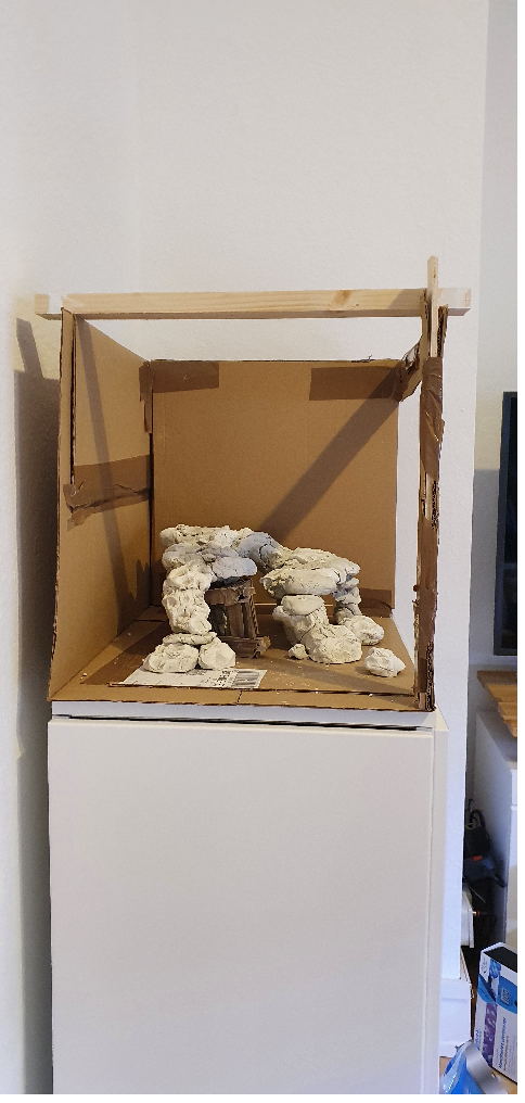 Hier nochmal Bilder vom Aufbau in meiner Aquarien Attrappe :D Sonst ist die Größe ja nur sehr schwierig abschätzbar. Maße des Kartons sind Außenmaße des Beckens (b = 60cm, h = 40cm, t = 40cm ) Die Technikkammer habe ich auch angedeutet. ( 1. Bild rechts) aufbau_1_1_front_in_Atrappe.png aufbau_1_1_se...