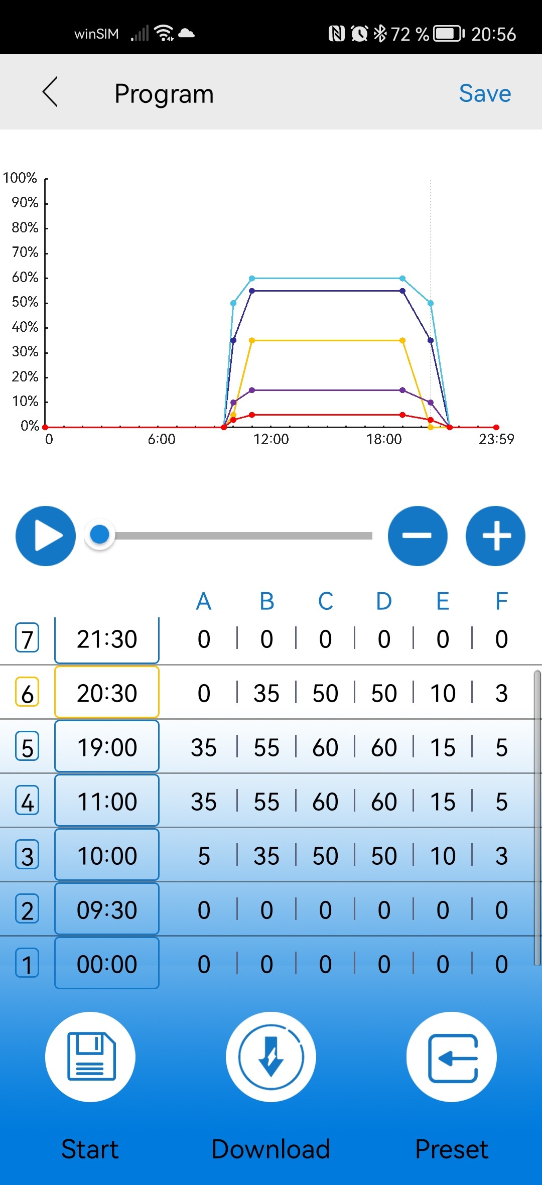 Hallo Jörg, genau darin liegt die Gefahr, daß abgebildete Spektrum der App passt eben nicht zur vorhandenen LED, Ich habe jetzt mal die Kanäle so eingestellt wie ich denke dass es eher passen würde. Kanal a ist weiß Kanal b ist UV Kanal c ist royal blue Kanal d ist purple Kanal e ist blau Kanal f is...