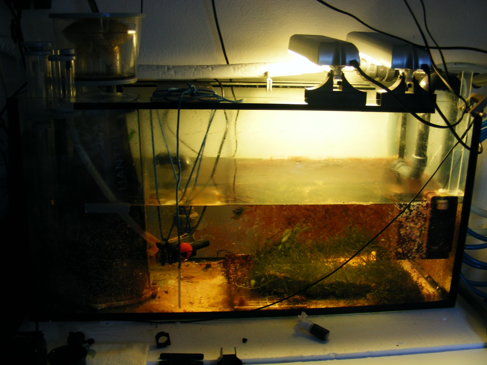 Hallo Günther, vielen Dank für die Tips. In dem Algenrefugium hatte ich gerade gut 2 Liter Algen geerntet, deshalb sieht es so kahl aus. Außerdem wollte ich andere Algen einsetzen und hab mir jetzt Drahtalgen geholt. Warum sollte sich das Lebendgestein im TB negativ auf die Wasserwerte auswirken? Wa...