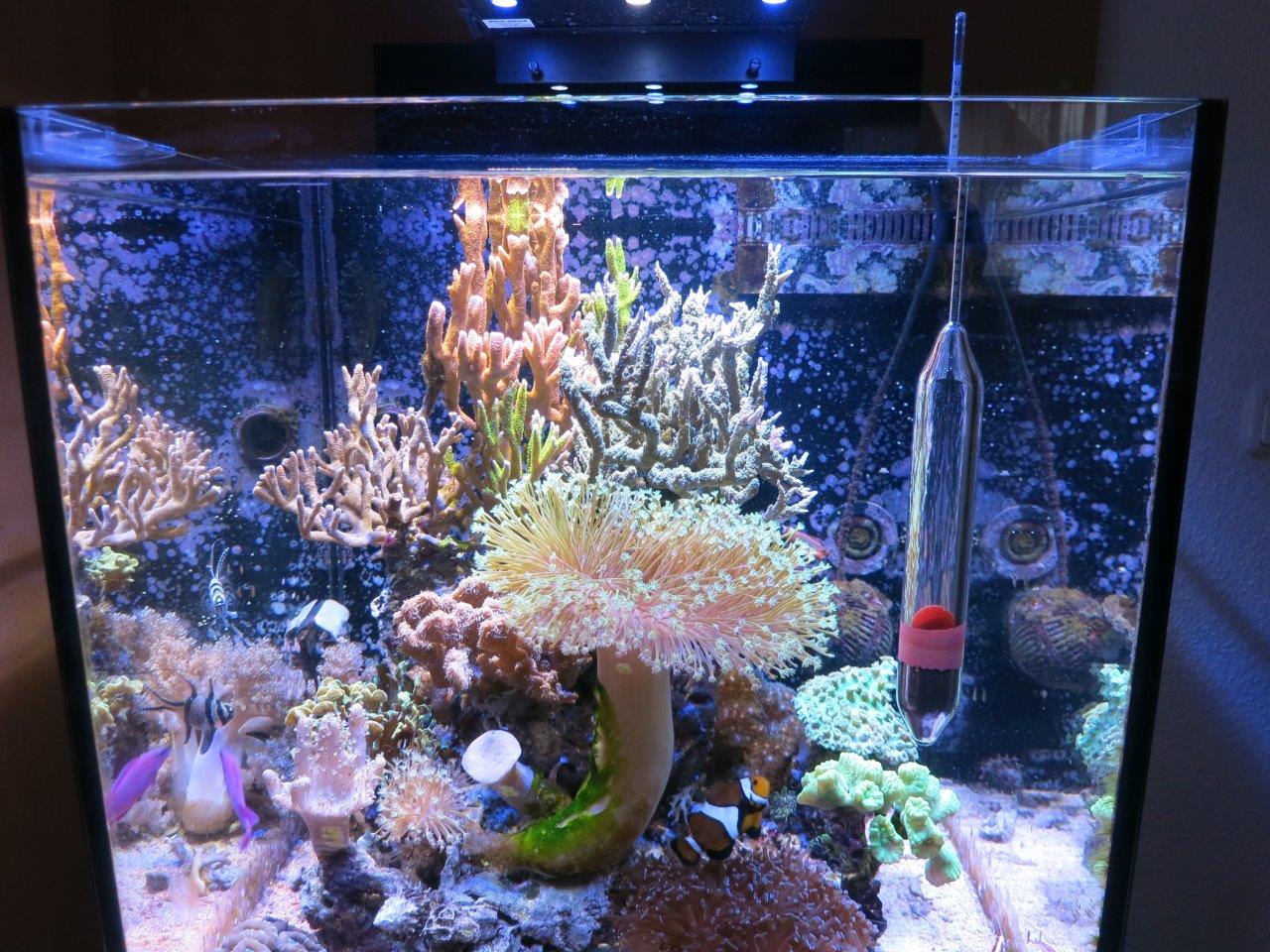 Ich kann mir einfach nicht vorstellen, was daran falsch sein sollte. Ich stelle alle Pumpen aus (mache ich sowieso immer beim Füttern), warte bis sich das Wasser vollständig beruhigt hat und hänge das Aräometer herein. Wenn es total ruhig schwimmt, lese ich von unten die Dichte ab, dabei gleichzeitig die Temperatur im AQ, idealerweise messe ich bei 25°C. Hinterher spüle ich das Aräometer mit Süßwasser ab.