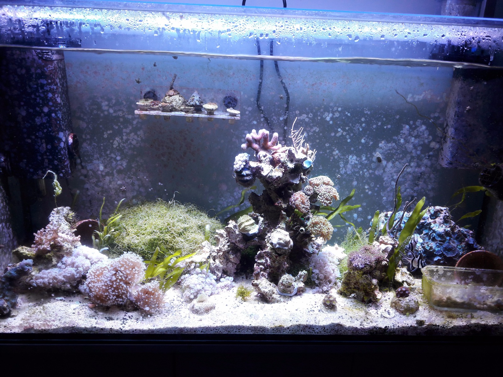 Beim Becken handelt es sich um ein 200L Becken. Die einzigen Tiere sind zwei Kaudernis, zwei Blaustreifen Seenadeln, Einsiedler, Garnelen, ein Globulus Seeigel und Schnecken. Dazu kommt ein Mischbesatz an Weichkorallen, SPS, LPS und höhere Algen. Alle Korallen zeigen ein schlechtes Farbbild (bleich). Die SPS zeigen noch ein schönes Polypenbild aber bei den LPS wurden die Polypen deutlich kleiner. Zoanthus wachsen nicht mehr und auch die Discosoma sind stark geschrumpft.
