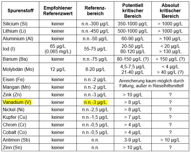 FM gibt den Referenzbereich für Vanadium von 1,2 bis 1,8 µg/l.
