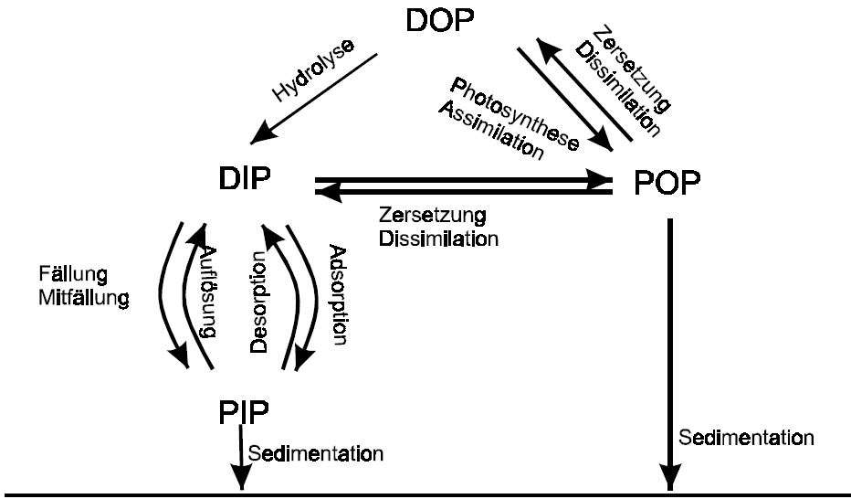 das Problem von Phosphor in unseren Aquarien ist, das es anderes wie bei Stickstoff nicht so einfach aus dem Becken exportiert werden kann. Phosphor kann nur in mineralischer Form gebunden oder adsorbiert werden. Die Oberflächen von Korallensand oder von lebenden/toten Steinen sind dazu in der Lage. Und hier spricht man dann von Phosphatdepots. Das angehängte Bild zeigt den Phosphatkreislauf im Wasserkörper, Wechselwirkungen zwischen DOP (disolved oganic phosphorus), DIP (disolved inorganic phosphorus), POP (particulate organic phosphorus) und PIP (particulate inorganic phosphorus). Die Adsorption an Hydroxide des Eisens und Aluminiums sowie an Tonminerale ist ein bedeutender Vorgang für die Phosphatsedimentation.