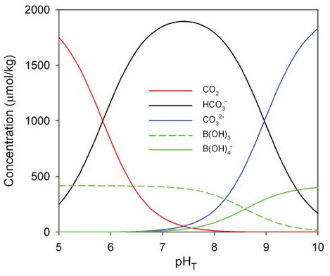 Im Falle von Bor ist die Verfügbarkeit recht einfach. Im Meerwasser liegt Bor vornehmlich als Borsäure vor. Es untersützt einwenig die Pufferkapazität im Aquarium. In der Gesamt-Alkanität spielt es aber eine geringe Rolle. Das Bild zeigt dies sehr schön. Das Bild zeigt die typische Verteilung der wichtigsten schwachen Säuren/Basen im Meerwasser als pH-Wert Funktion.