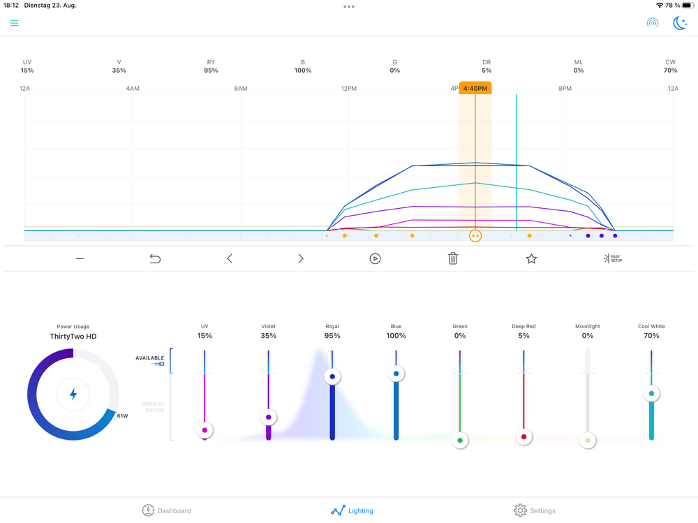 Hi, danke für die Info, fahr bitte das Licht mal runter, Du beleuchtest zu stark und das ist für das junge Becken mit dem geringen Besatz noch zu viel, entsprechend bekommst Du schneller Algen. Ich würde statt 100% Blau nur auf 80% gehen und alle anderen Kanäle entsprechend auch runter ziehen, also um jeweils 20% relativ zu weiß. D.h. nicht 20% absolut, sondern am Beispiel Royalblau 95 x 0,8 = 76%. So kannst Du das für die jeweiligen Kanäle ausrechnen. Aber so ist das Licht zu hell und Du bekommst daher auch schnell Algen.
