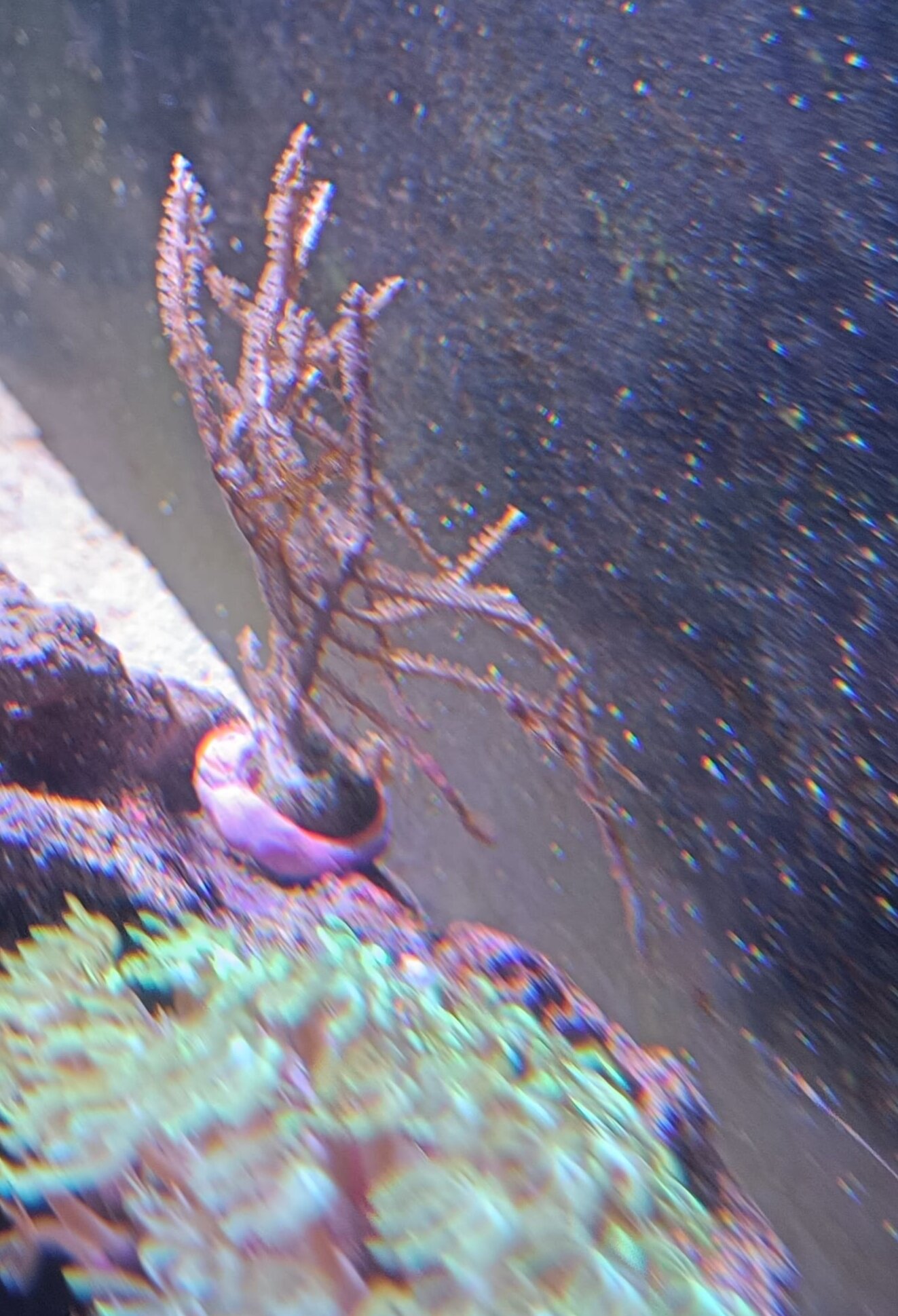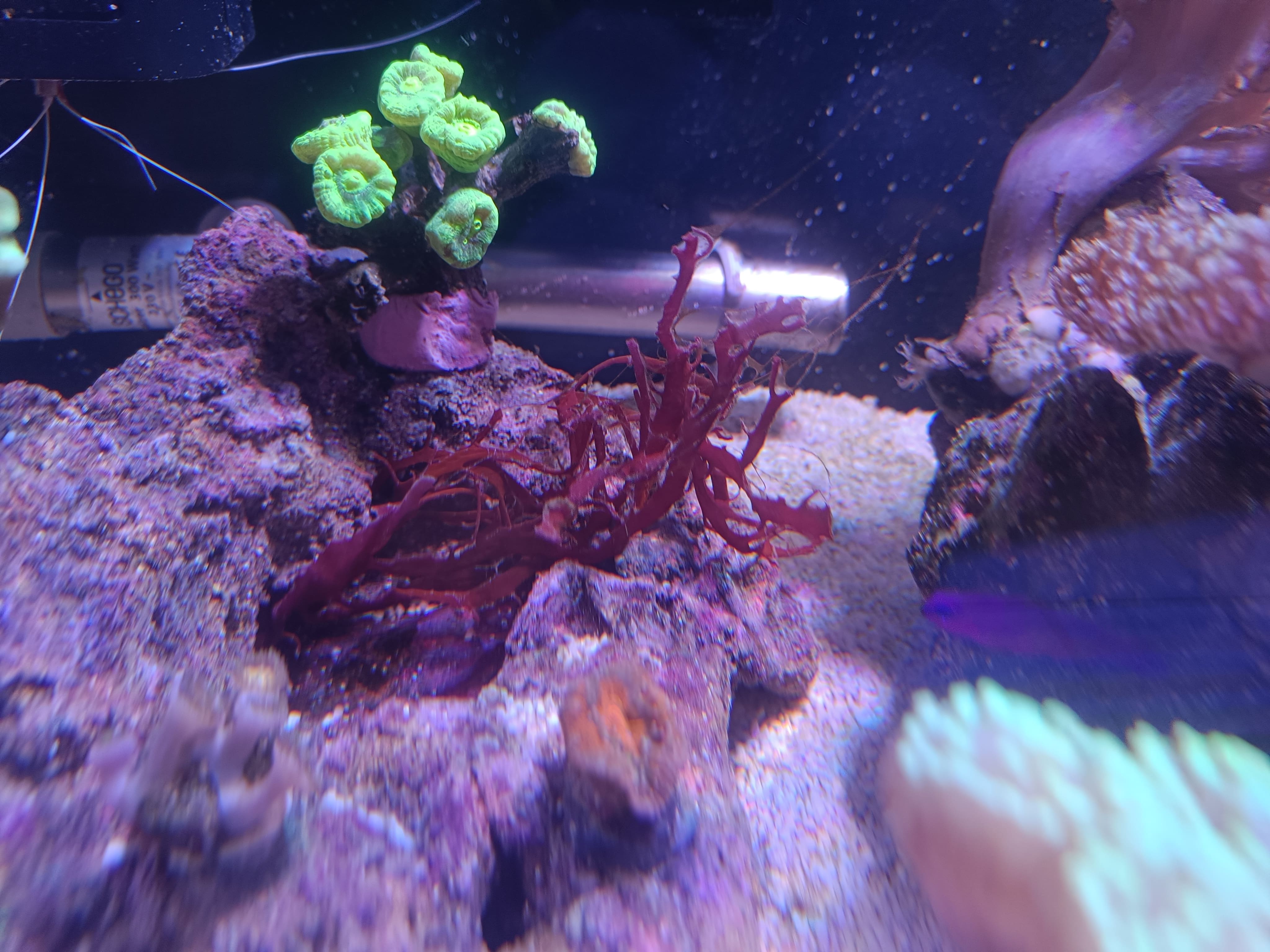Zur Optik....lange braune Fäden. Anfangs dachte ich meine Koralle häutet sich. Mittlerweile ist auch der Boden leicht überzogen.