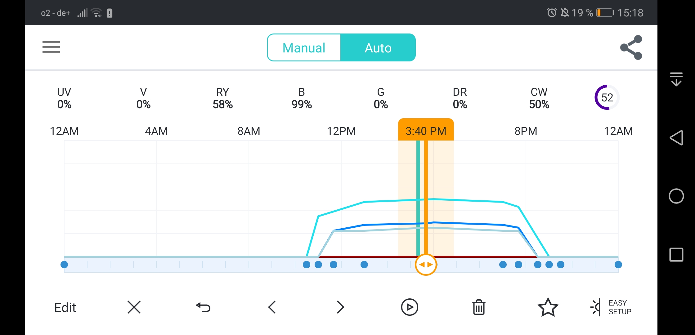 Ferner habe ich die Beleuchtung gedrosselt. Da vornehmlich Royal Blue um 20 Prozent gesenkt und UV, sowie Violett aus. Grün und Rot hatte ich immer aus.