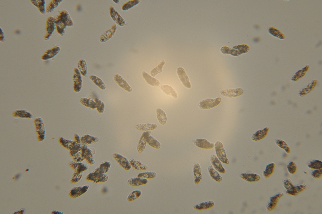 Die Koralle verliert seit Tagen an Gewebe. An den Kanten zwischen Gewebe und abgestorbener Koralle konnte ich ein braun-gelber-Schleim feststellen. Dieser ist jedoch immer kleiner geworden und auch der Geweberückgang hat etwas stagniert. Ich konnte unter dem Mikroskop ein paar Fotos von den sehr aktiven Gesellen, welche sich scheinbar an der Koralle befinden, machen. Ich bin mir fast sicher, dass es sich leider um Brown Jelly handelt, würde aber gerne noch kurz Eure Meinung dazu hören.