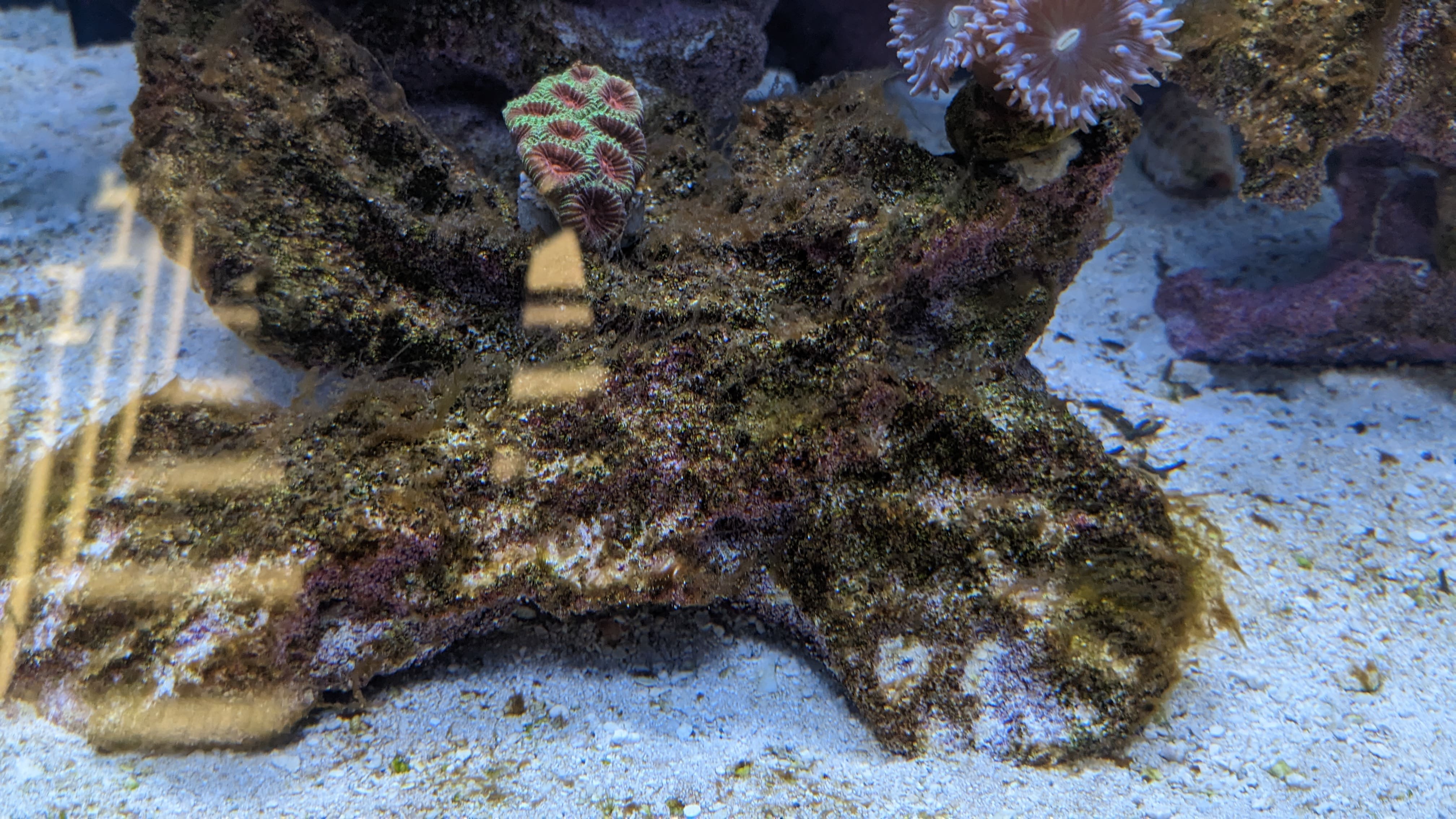 wäre ein Platz, aber die Korallen halten die nicht auf. Ich würde sie eher wirklich auf einen separaten Stein setzen. Die werden von unten den Basisstein hoch wachsen und können dann theoretisch von unten her vernesseln. Aber das dauert eine Weile. Kann man aber da hin setzen, ich würde sie eher auf einen separaten Stein platzieren.