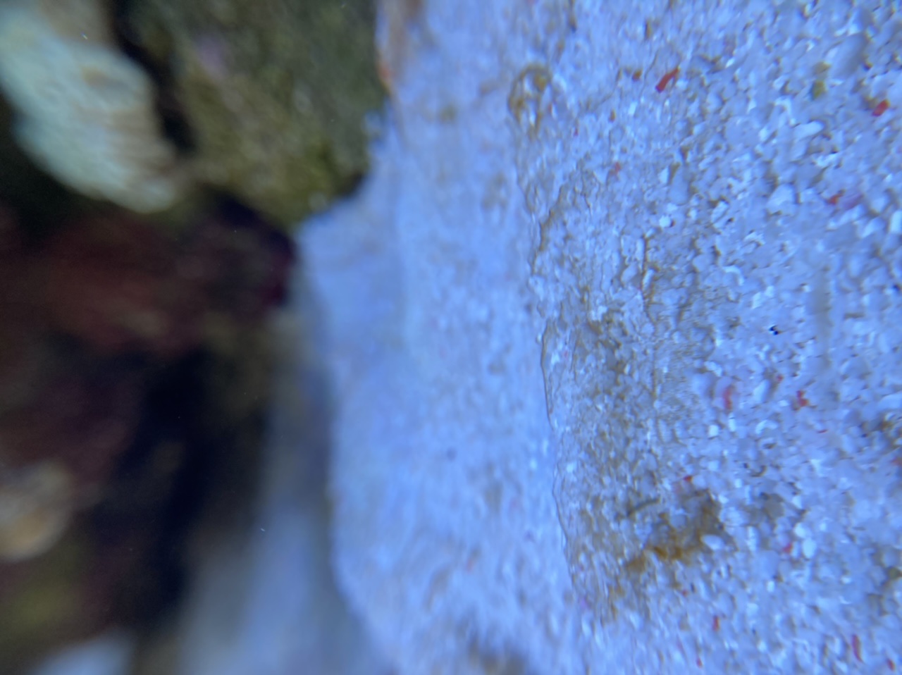 Die auf der Rückwand schon, die letzten Bilder am Sand zeigen ziemlich eindeutlich ausgestoßene Zooxanthellen. Aneinander gereihte Zellverbände gibt es bei verschiedenen Mikroalgen, da müsstest Du auch falls möglich ein Foto zeigen.