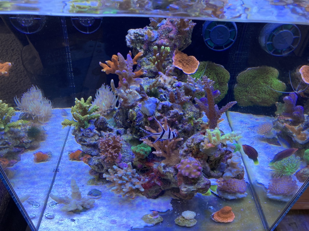 deine Tiere stehen ja alle sehr gut, so sind die Cyanos optisch störend, ggf. kannst du versuchen sie mehrmals täglich vom Gestein abzublasen.
