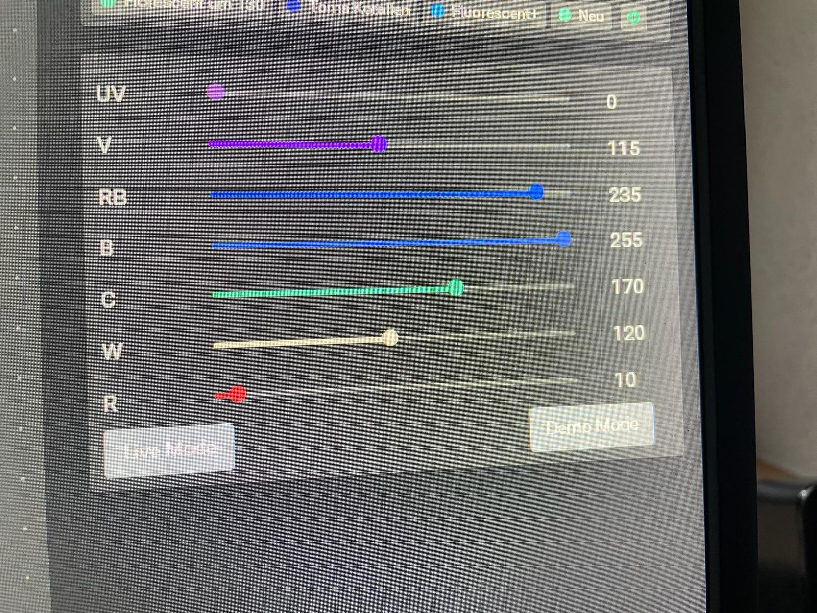 Danke für die rasche Antwort und die Infos zur Beleuchtung. Du musst UV nicht zwingend ganz ausschalten, wenn Du das bei 10-20% einstellst in dem Rahmen, sollte das auch passen. Violett würde ich noch etwas weiter senken, aber ansonsten passen die Einstellungen so. Wenn das erst seit dem Wochenende so läuft, würde ich mal abwarten, wie das Becken reagiert.