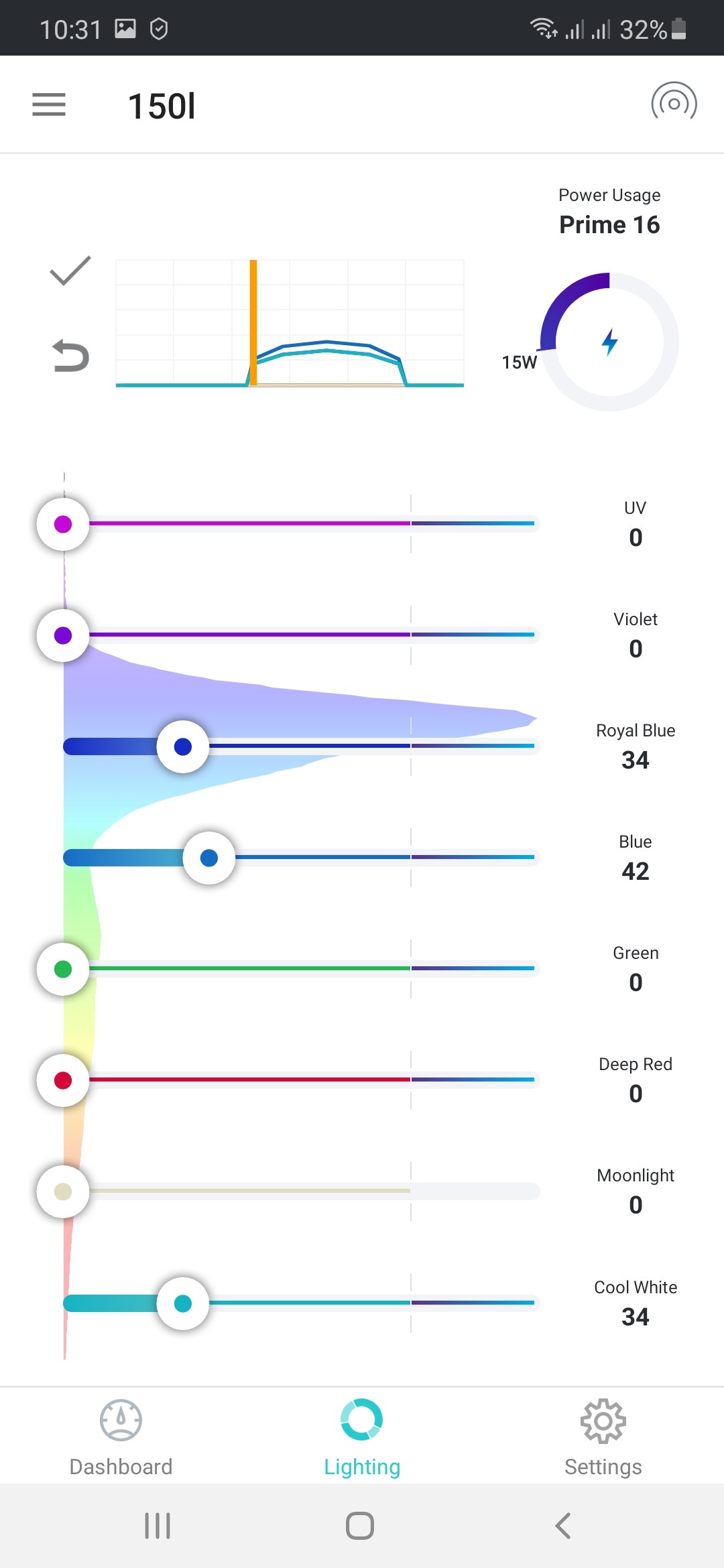 Lampeneinstellung: über dem Becken sind eine Hydra 26 und eine Prime 16 HD, am Anfang waren sie so eingestellt, dass beide zum Tageshöchstpunkt etwa 30 Watt Leistung gebracht haben. Seit etwa 1 Woche, seit die Cyanos komplett aus dem Ruder laufen, habe ich die Gesamtintensität etwas runtergefahren, auf max. 24 Watt (auch weil die SPS an lichtexponierten Stellen zwar Polypen zeigen, diese aber hell werden). Außerdem habe ich rot, grün und violett komplett rausgenommen und den weißen Kanal auf 80% runtergestellt (ist jetzt also gleich hoch eingestellt wie royalblau).