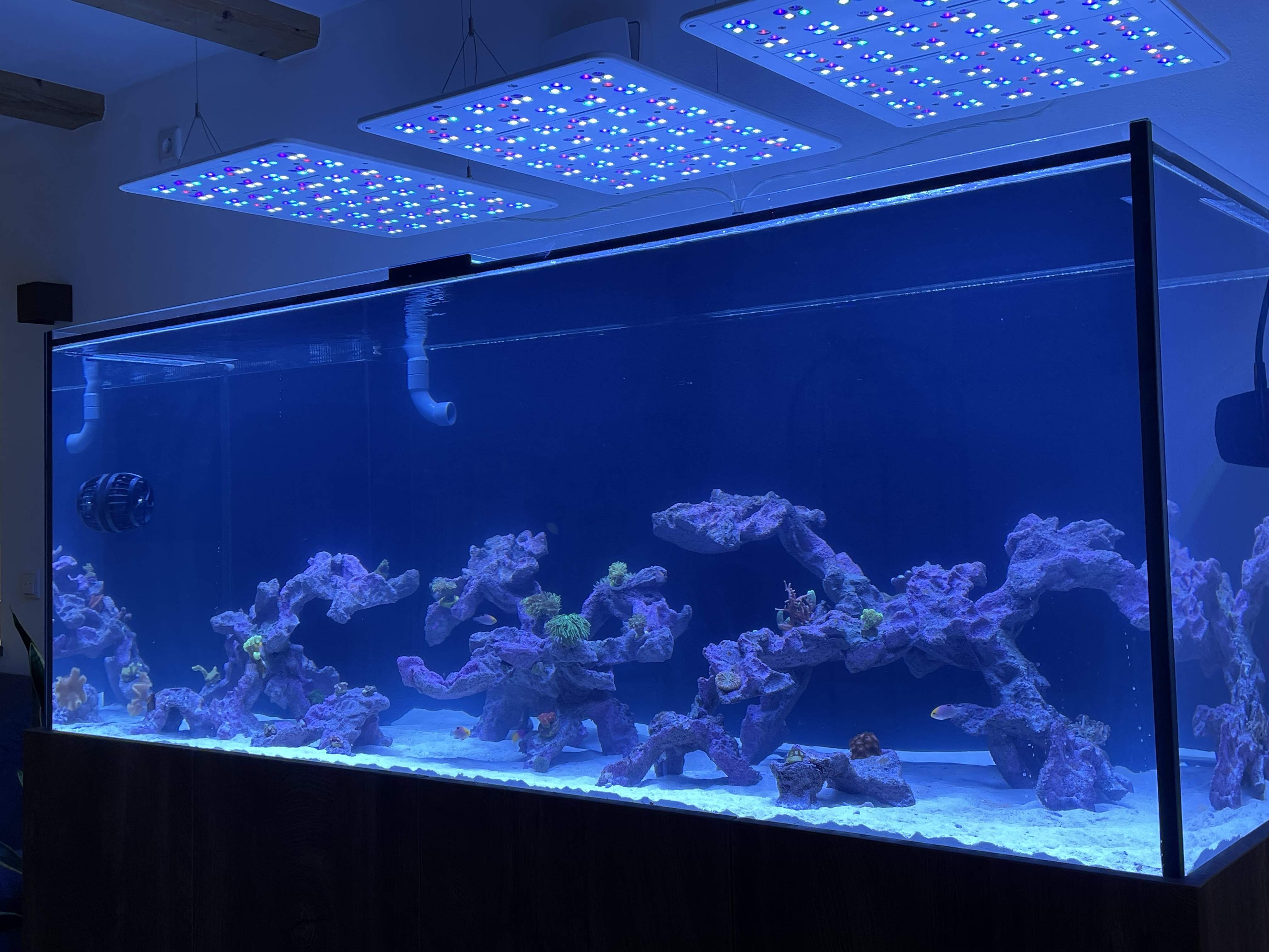 Wo ich mir am unsichersten bin, ist die Strömung, ich habe immer das Gefühl diese wäre viel zu Stark, deshalb bin ich auch bereits von 40% auf 20% runtergeganen. Eins darunter ist ein Bild meiner aktuellen Strömungspumpen Anordnung. Hätte jemand ein paar Tipps zum Thema Strömung?