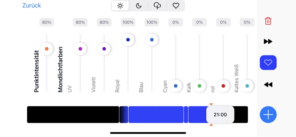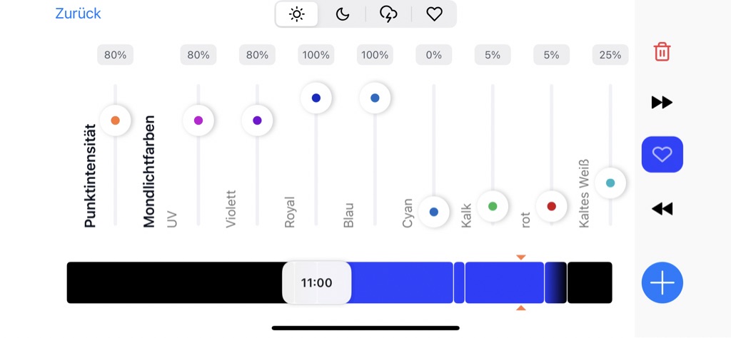 Sonnenaufgang und Untergang hab ich bereits auf 1,5 Stunden geändert, UV und violett erstmal um 5% reduziert, und weiß um 5% erhöht.