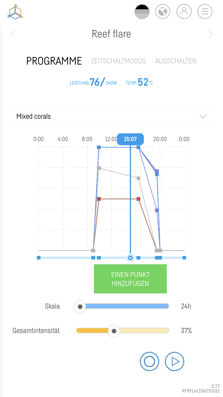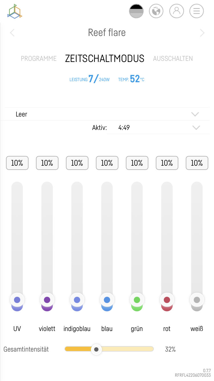 Die Lichteinstellungen sind nicht ganz so optimal für den Start ehrlich gesagt. Ich empfehle für die Reef Flare ähnliche Einstellungen wie für die Radions G5/G6. Rot würde ich auf max. 10% einstellen. UV 20-25%, Violett 30-35%. Royal/Indigoblau auf 80%, normales Blau 100%, Grün und Rot auf 10%, Weiß je nachdem wie hell Du es machst zwischen 60-100%, das kannst Du einstellen, wie es Dir optisch vom Licht her gut gefällt. Und dann die Intensität idealerweise tatsächlich einmal ausmessen mit eine Quantummeter (Apogee MQ-510, Parwise, oder Photonen App für iOS). Dann kannst Du die Intensität in der Beckenmitte auf ca. 300-350 µmol ("PAR") einstellen, was für das Becken dann unten zwischen 150-200 µmol und oben auf dem Riffdach ca. 400-max. 450 µmol bringen sollte. Höher würde ich nicht beleuchten zum aktuellen Zeitpunkt.