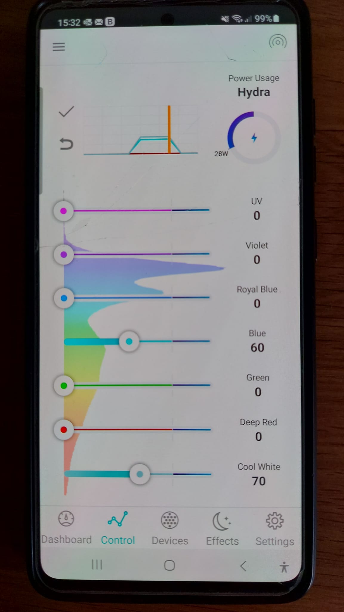 Kannst Du bitte mal einen screenshot von den Hydra Einstellungen posten. Royalblau gar nicht zu benutzen macht eigentlich wenig Sinn, weil das ein photosynthetisch relevanter Strahlungsbereich ist. Kurze Wellenlängen wie UV und Violett würde ich niedrig fahren oder bei Dinos sogar auch ausschalten, Rot und Grün ebenfalls aus. Ich würde mir das Profil und die Einstellungen gerne mal anschauen.