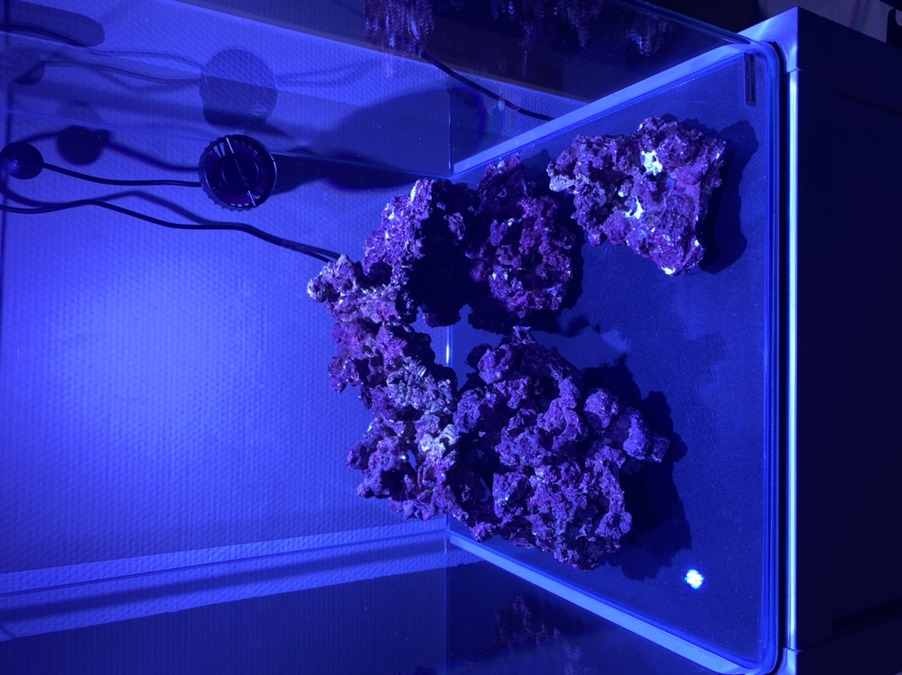 mittlerweile steht das Dennerle 60l Nano Cube. Der Riffaufbau hat auch seinen Weg ins Becken gefunden. Ich bin ganz zufrieden. Ich bin aber etwas unschlüssig, ob der Aufbau zu niedrig ist? Er reicht knapp bis zur Hälfte der Beckenhöhe. Klar, man soll Luft lassen - aber so viel? Ansonsten bietet er glaube ich genug Stellfläche für die Korallen und ist ziemlich luftig und sollte relativ gut beströmt werden können.