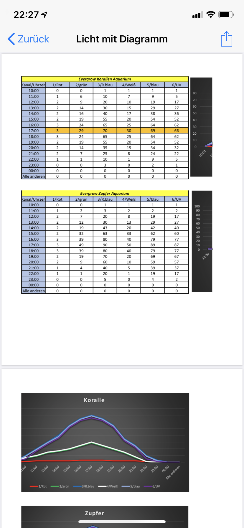 Die prozentuale LED Einstellung der unterschiedlichen Farbspektren ist nicht optimal. Für die meisten LED Lampen ist es als allgemeine Empfehlung sinnvoll, den weißen und den langwelligen blauen LED-Anteil (460-480 nm) in etwa gleich hoch zu betreiben, und den royal blauen LED-Anteil 15-20% niedriger einzustellen, weil genau dieser Wellenlängenbereich energiereicher ist und in hoher Intensität v.a. bei punktueller Beleuchtung potentiell Strahlungsstress erzeugen kann, und zudem die weißen LEDs bereits eine Royalblau-Emission aufweisen. Kaltweiße LEDs basieren in der Herstellung auf einer Royalblau-LED und zeigen daher typischerweise bei ca. 450 nm baubedingt eine signifikante Strahlungsemission, weshalb der Anteil royal blauer LEDs in Relation zu den blauen LEDs in der Gesamtkonfiguration auch geringer ausfallen sollte. Wenn für eine bestimmte Lampe in dieser Konstellation das Licht zu hell/weiß ist, sollte nicht der Blauanteil weiter erhöht, sondern im Rahmen der Einstellmöglichkeiten stattdessen bevorzugt der Weißkanal etwas zurückgefahren werden. Die Anpassung in diese Richtung ist sehr wichtig, andernfalls kann der zu hohe Blauanteil Strahlungsstress erzeugen. Die royal blauen LEDs sollten nicht höher geregelt sein als die normal blauen LEDs, weil die Zooxanthellen durch ihre Chlorophyll-Peridinin-Kopplung in den Photosystemen eher im langwelligen Blau absorbieren. Für Einsteiger und LED-unerfahrene Anwender gilt die Empfehlung, bei violetten/“UV“ LEDs nur circa 10-20% der individuell möglichen Lampenleistung zu nutzen, um Strahlungsstresszustände in Korallen zu verhindern.