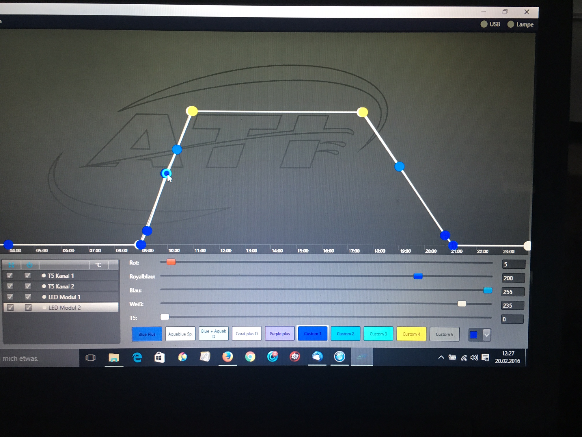 Insgesamt hast Du aber jede Menge Licht über dem Becken. Fahr mal die T5 etwas runter und nicht auf Volllast. LED und T5 würde ich die Profile jeweils übereinander legen, dass das Licht über den Tag gleich bleibt. So hast Du Lichtschwankungen drin und das gilt es zu vermeiden.