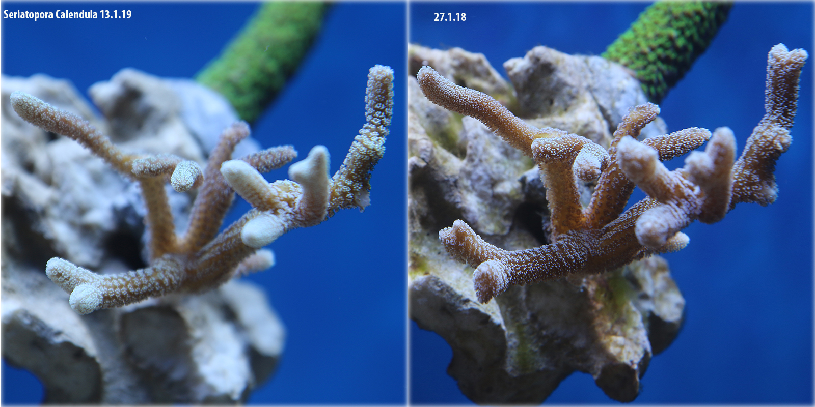 Auch die Seriatopora wächst, an 2 Enden sehe ich wie sich eine Gabelung ausbildet