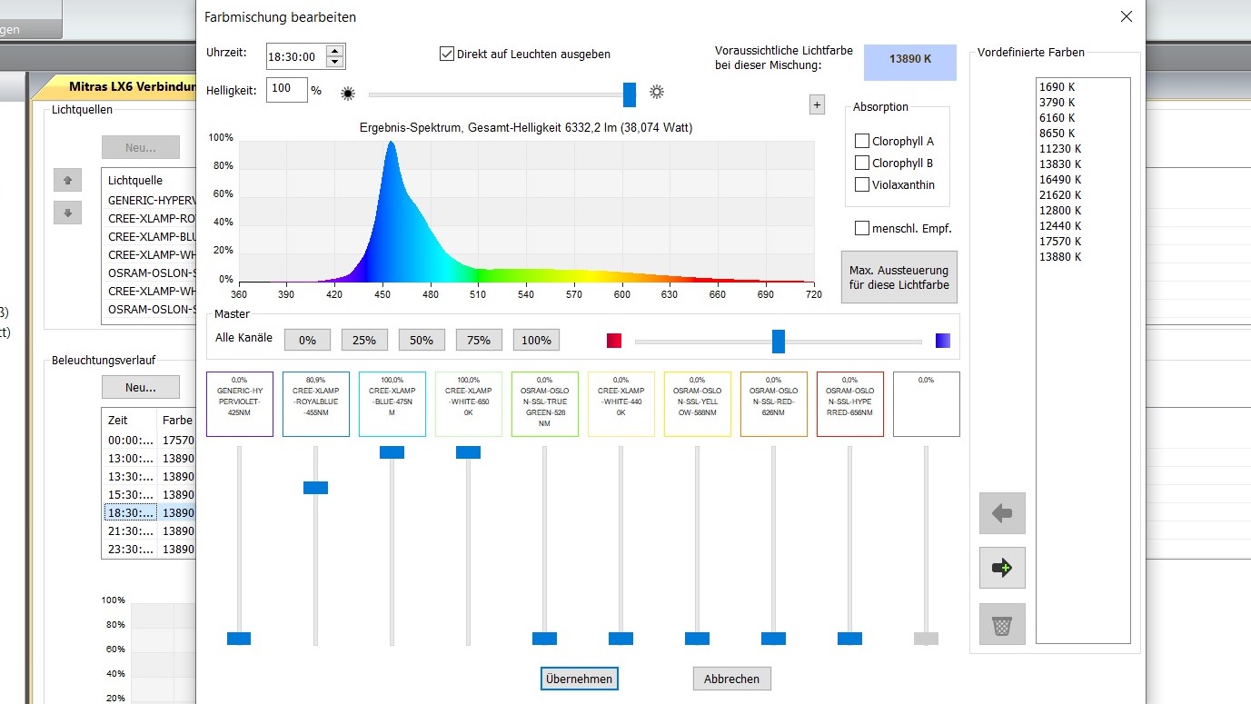 und den 425 nm Kanal über 10 Tage verteilt auf 25 % - jeden zweiten Tag dann um 5 % steigern. Das dürfte dann das Spektrum noch breiter machen im 450 nm Bereich.