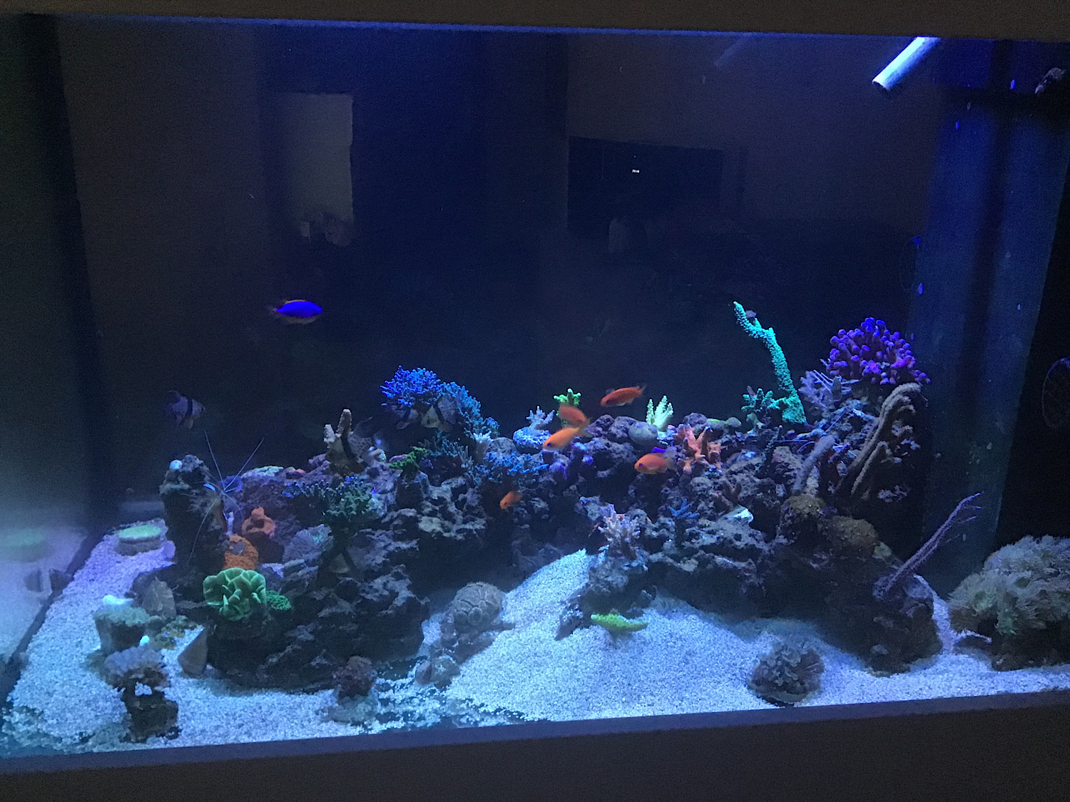 die Wasserwerte bringe ich langsam ins Soll. KH liebt bei ca. 7,5, CA liegt noch bei 450 und Phosphat liegt bei 0. Licht hat die empfohlenen Einstellungen, wobei ich Violet wieder von 20 auf 10 Prozent zurück gesetzt habe. Veränderungen sind nicht vorgenommen worden und die Strömung sollte dort ausreichend sein.