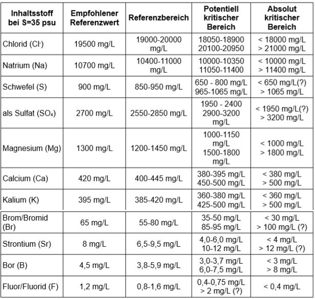 Hi Michael, da brauchst nicht einkaufen gehen. Du solltest die sehr hohen Werte wie Kalium, Magnesium durch Wasserwechsel in einen optimalen Bereich bringen. Anbei die Referenzwerte für Hauptkomponenten/Makroelemente aus SEAZ. Bor ist extrem niedrig und Strontium überhaupt nicht nachweissbar; da bist Du schon im absolut kritischen Bereich. Solche Werte habe ich auch noch nie gesehen. Das heißt heute anstatt Korallen kaufen gehen ist WW angesagt. Deine Salinität in Relation zu den Hauptelementen wird erhöht sein; auf jeden Fall über 35psu.