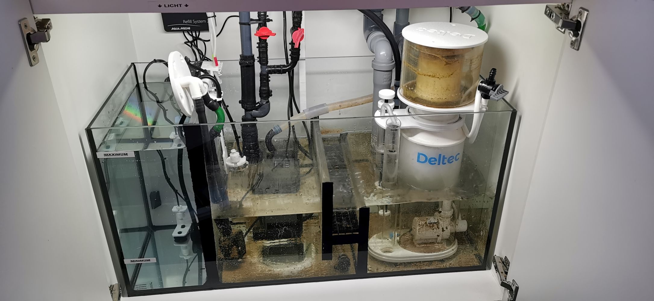 Hier unser Becken: ...und unser Technikbecken (hier fehlt gerade der Dupla Fliessbettfilter) Unser Hauptaugenmerk liegt aktuell auf den viel zu hohen Nitratwert, welchen wir einfach nicht reduziert bekommen. Inzwischen sind wir wirklich sehr hilflos und fragen uns, was wir wohl falsch machen. Die Korallen stehen eigentlich ganz gut da. Allerdings ist unser Hawai Dok in letzter Zeit deutlich gestresster und aggressiv wenn wir ins Becken gehen, zudem fehlt seit Tagen unser Lippfisch. Auswirkungen des zu hohen Nitratwerts?