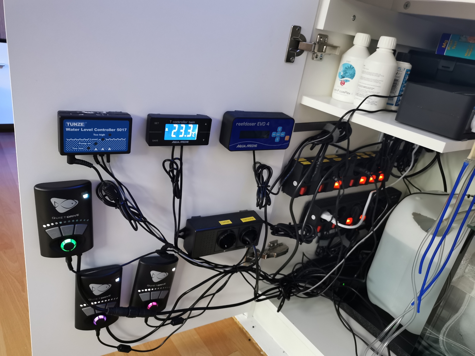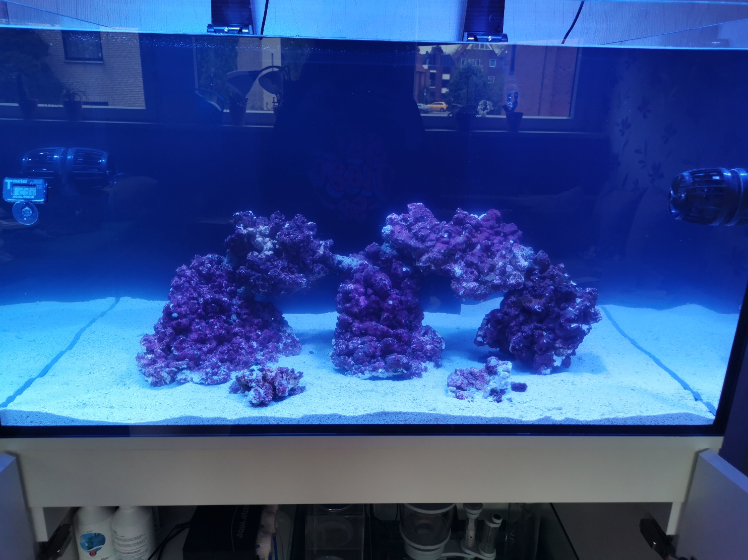 Bis jetzt habe ich einen leichten Kieselalgenbelag vorne links. Ich schätze mal, dass dort nicht genügend Strömung ankommt. Die Beleuchtung, die Strömungspumpen und die Rückförderpumpe laufen über die Mobius App, was nach anfänglichen Schwierigkeiten sehr gut funktioniert.