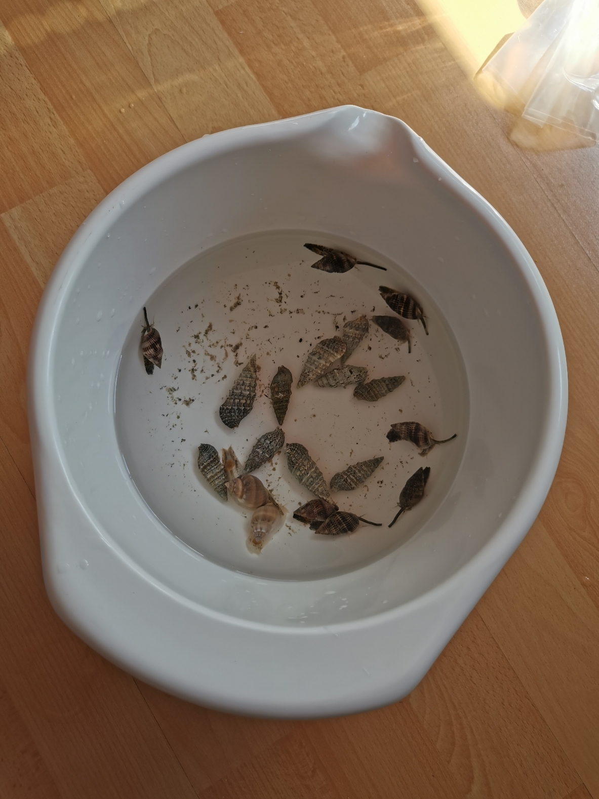 heute ist Tag 6. Seit heute bewohnen ich 10 Nassarius sp. und 10 Cerithium sp. Das Becken. Eigentlich sollten schon gestern die ersten Korallen kommen. Leider ist wohl etwas bei der Bestellung schief gelaufen. Also kommen sie erst morgen rein.