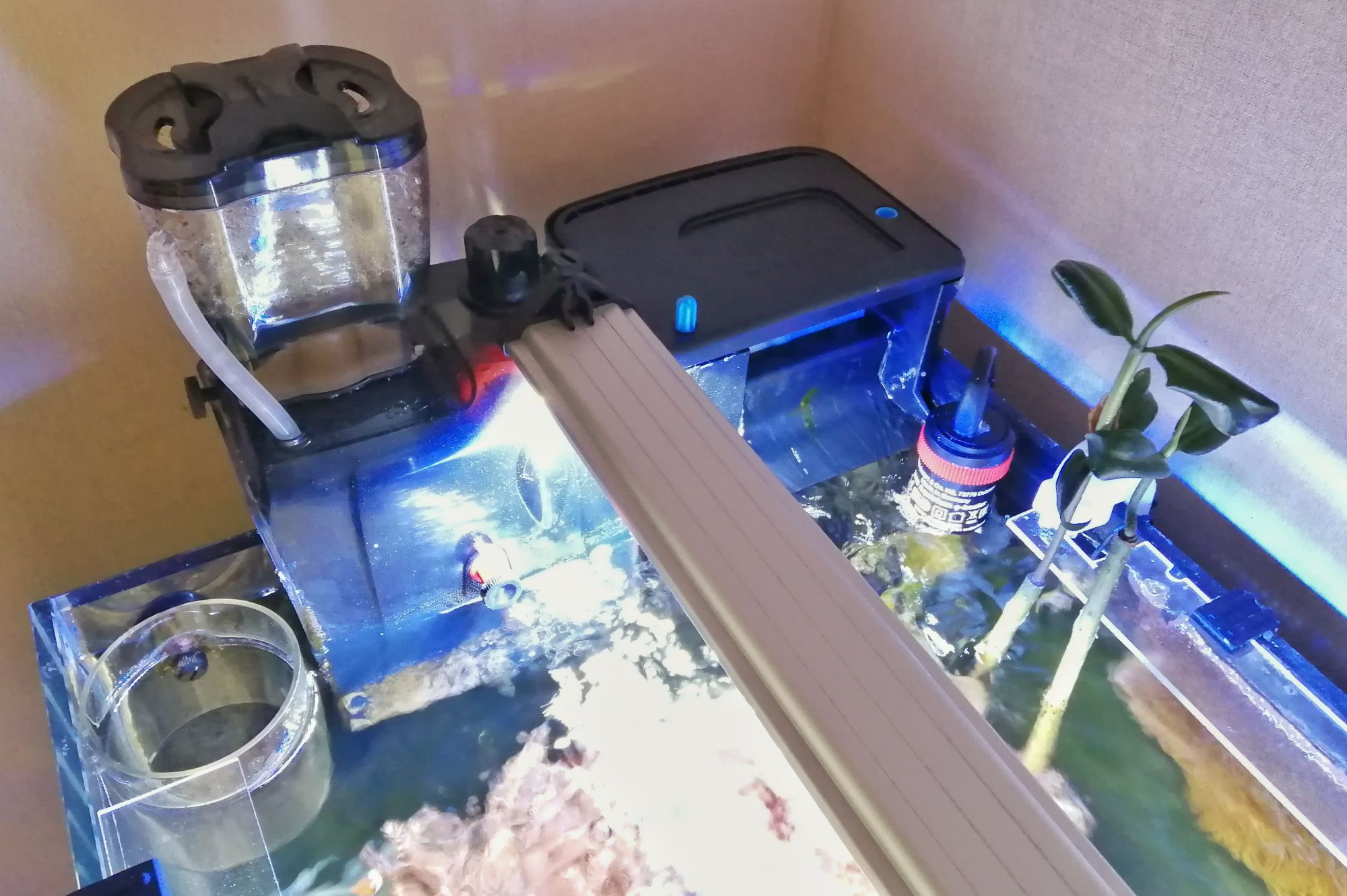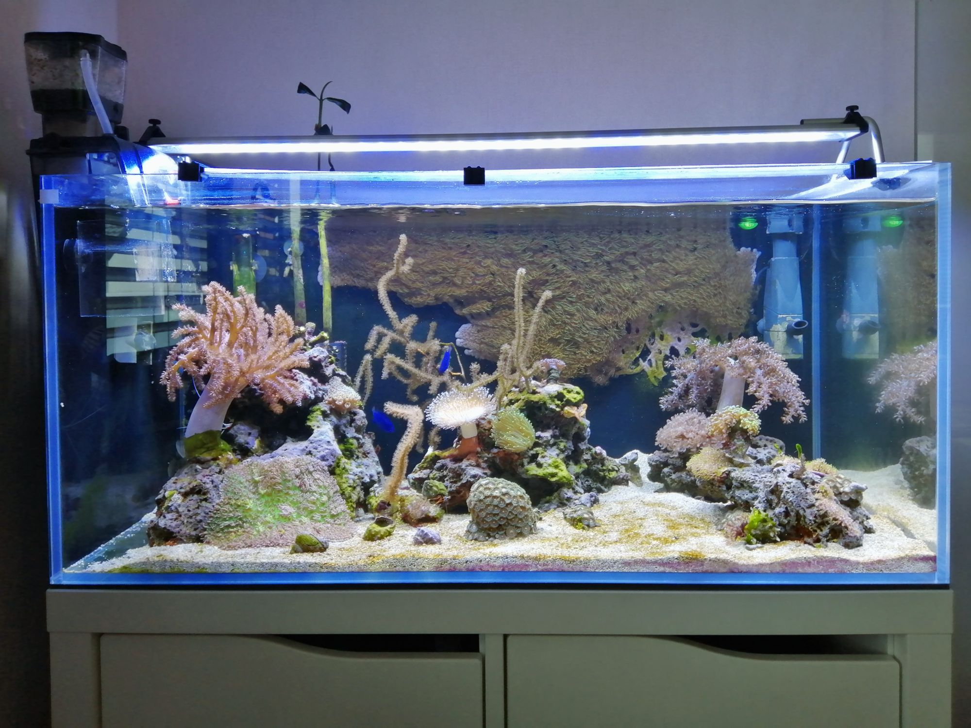 Ich habe mir ein Weißglas-Poolbecken ca.100 Liter passend zu einem KALLAX "Unterschrank" kleben lassen und betreibe es ohne Technikbecken, Filter (Tidal 35) und Abschäumer (BubbleMagus QQ1) als Hang on, zusätzlich noch ein Eheim Skimmer als Oberflächeneinzug und eine 4000L Strömungspumpe die ungeregelt läuft.