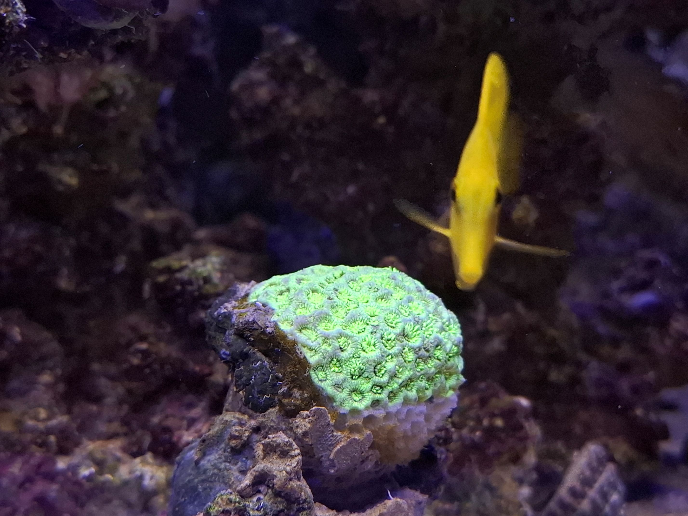 1. Die Zoanthus haben letztes Jahr stark geblüht (wenn man das so sagen kann). Ich hatte laut ICP irgendwann zu viel Jod und hörte damit auf zu dosieren. Das war vor ca. 1 Jahr. Sicher gab es auch andere Schwankungen bei anderen Werten - mir sind allerdings keine mehr in Erinnerung, Jedenfalls war es mit dem Wachstum vorbei. Bis heute zeigen sich diese Zoanthus nicht gut. Und ich habe keine Ahnung warum. 2. Obwohl ich Gonis habe, die sehr stark wuchsen und die ich leider ernten musste, gibt es da einen Kopf mit Gonis, die mir Sorgen machen. Machmal kommen die Polypen etwas hervor. Machmal - so wie heute - gar nicht. Das ganze ist ungefähr seid einem halben Jahr so. Zu hell? Zu dunkel? Fehlt Irgendwas? Laut ICP dürfte da doch nichts fehlen.