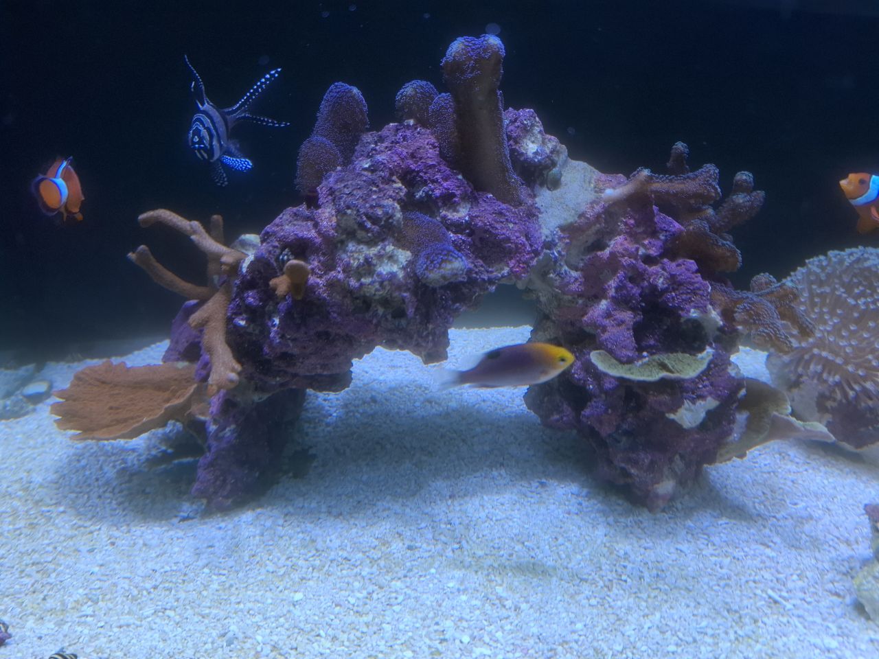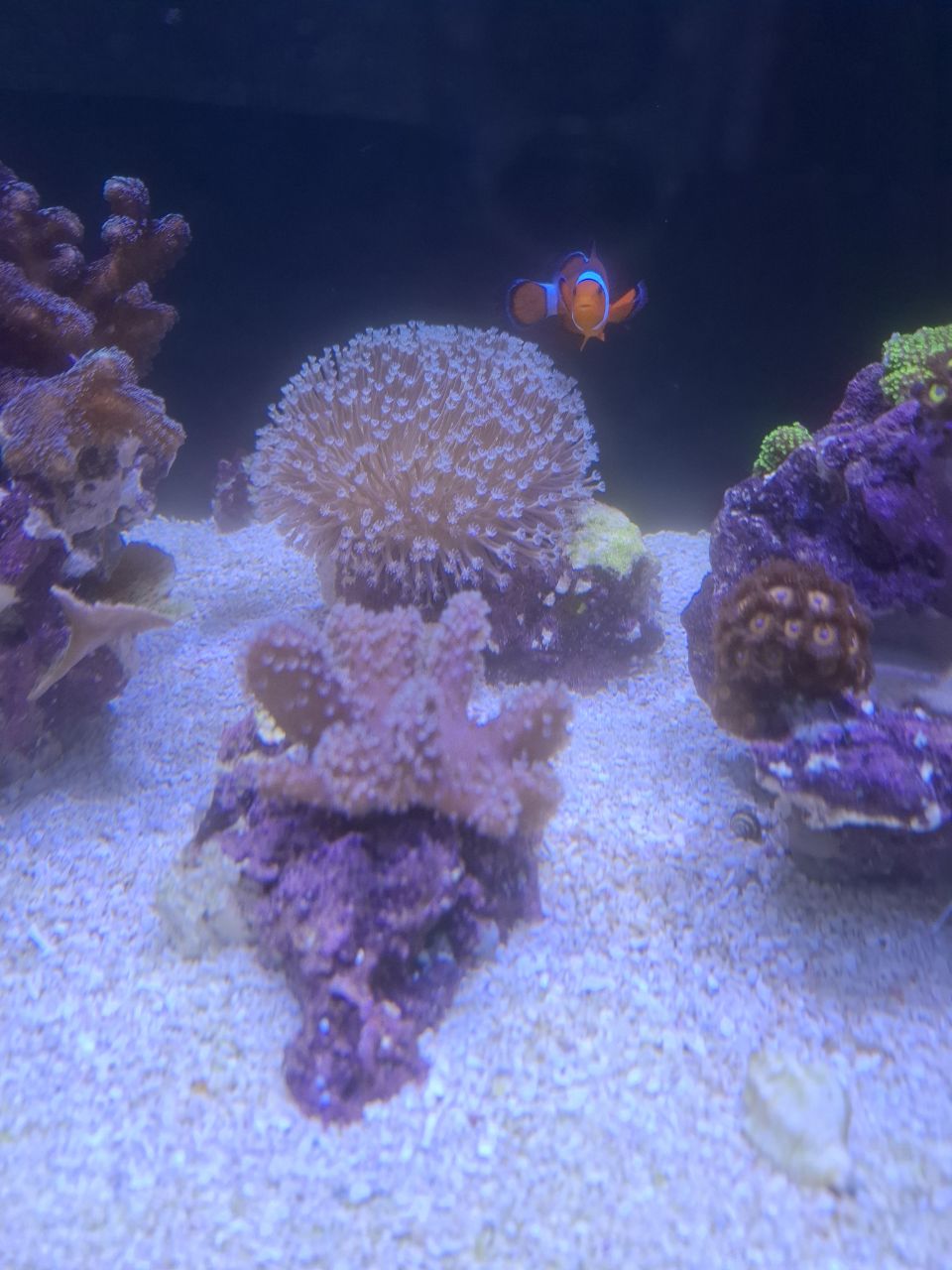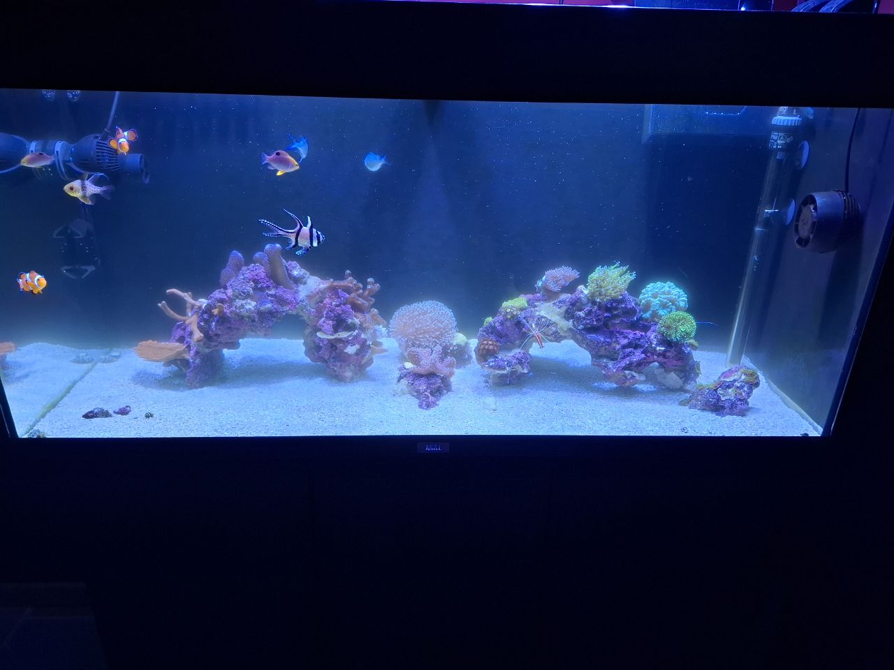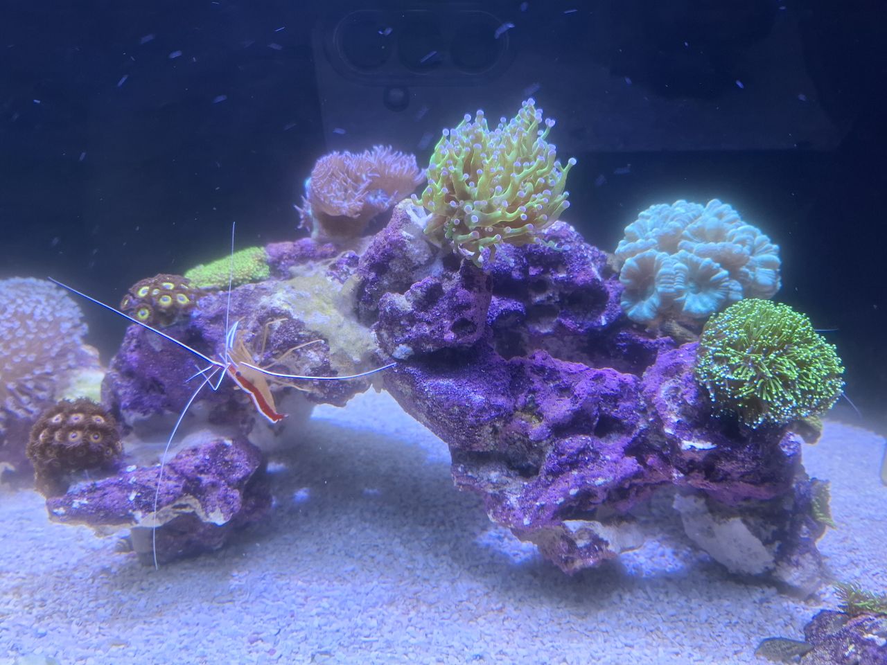 Sonst lief der Start bisher auch gut, Nährstoffe sind vorhanden, es sind keine Korallen oder Fische gestorben. Nur eine Schnecke hat es nicht geschafft, könnte daran liegen das es fast 2 Wochen gedauert hat bis die ersten Beläge/Algen zu sehen waren. Jetzt wachsen die Grünanlagen so gut das ich stündlich die Scheiben sauber machen könnte. Daher haben die Fotos einen leicht "trüben" Stich. Das sind die Algen im Wasser die ich kurz vorher entfernt habe.