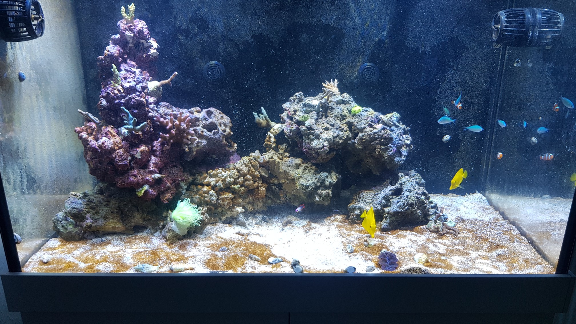 Ich habe mir Deinen thread hier nicht durchgelesen, das Thema Gestaltung wird sicherlich schon irgendwo thematisiert worden sein. Du hast links extrem hoch und dicht an der Scheibe gebaut, das ergibt Probleme mit der Beströmung und der Strömungsausbreitung. Ich würde bei dem Becken v.a. von rechts nach links mit 2 Pumpen (eine vorne, eine hinten) beströmen, damit Du da hinten keine Ablagerungen und eine gute Strömungsausbreitung bekommst und es dann auch noch eine passive Rückströmung wieder nach rechts ergibt. Der Aufbau ist etwas zu groß und v.a. zu weit links für meine Begriff. Das kannst Du langfristig nur mit mehreren Pumpen beströmen.