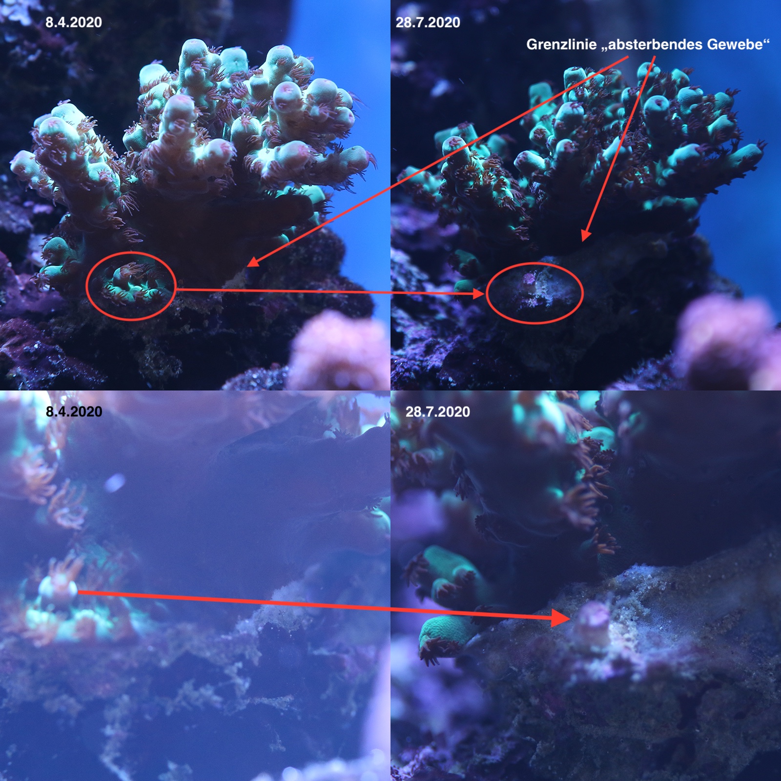 es ist frustrierend - von den 16 Acroporen im Becken gammeln inzwischen 10 von unten her weg. Es ist teilweise ein wirklich sehr langsamer Prozess, so hat z.B. meine Sarmentosa von April bis Juli vielleicht 5-6mm der Basalscheibe eingebüsst (siehe Bilder). Das verrückte ist, dass bei manchen die Basalscheiben vor sich hin gammelt, sie oben aber deutliches Wachstum zeigen (das ist bei den Bildern der Sarmentosa nicht richtig sichtbar, bei anderen Acroporen aber sehr deutlich).