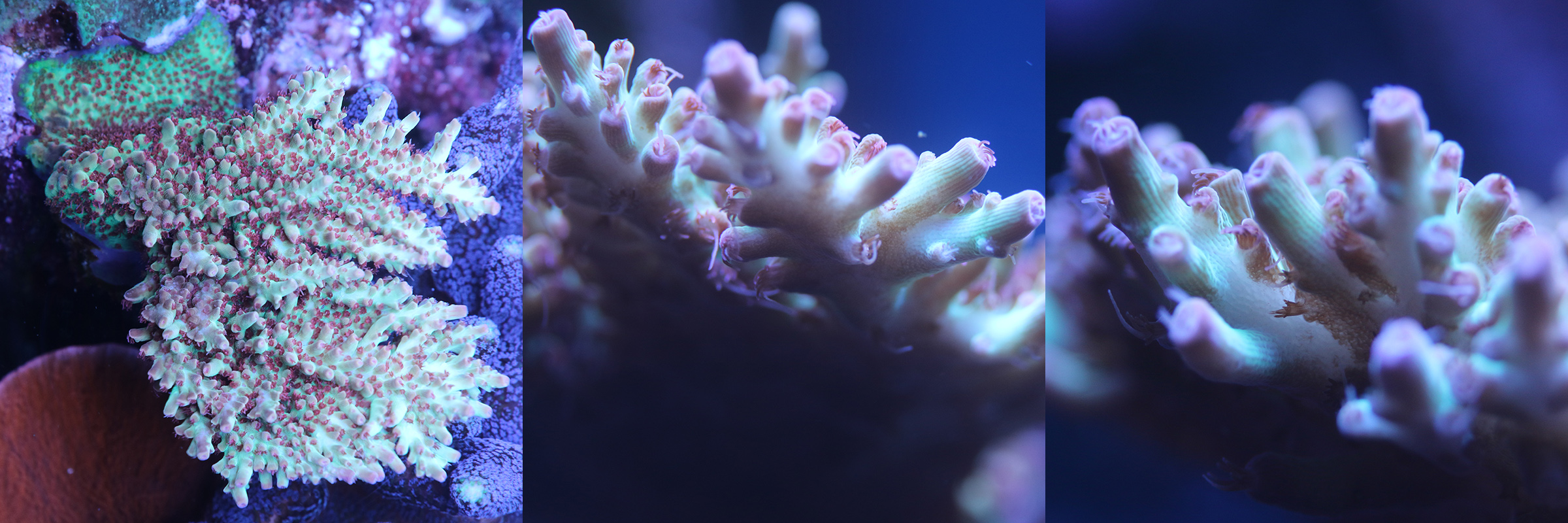 Ich habe versucht bessere Bilder der weiss werdenden Bereiche in kurzen Abständen zu machen, um sicher zu gehen, dass irgendwelche Punkte keine red/black Bugs sind...konnte darauf aber keine wandernden Punkte sehen. Auch Strudelwürmer hoffe ich ausschließen zu können, da ich 3 "befallene" Acros rausgebrochen und gedippt habe - ohne Bewohner. Knabbernde Fische kann ich ausschließen, Wurdemanns-Garnelen machen auch nicht so einen Mist, oder?