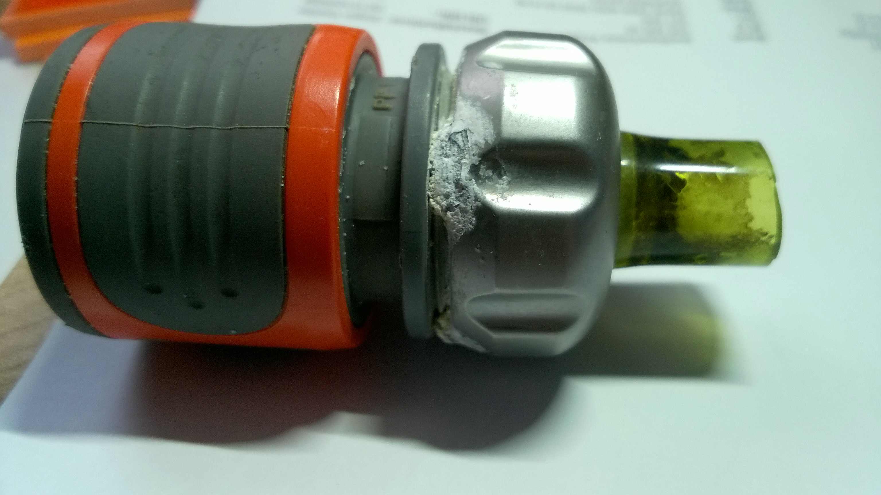 Hier scheint einer der Übeltäter für die Schwermetalle, aber nur im Wechselwasser, zu sein: Das ist der Ausgang des Schlauches von der Förderpumpe, mit der das frisch angesetzte Salzwasser in das Aquarium gepumpt wird. Der Schlauch liegt in der Regel über Nacht mit im Tank.