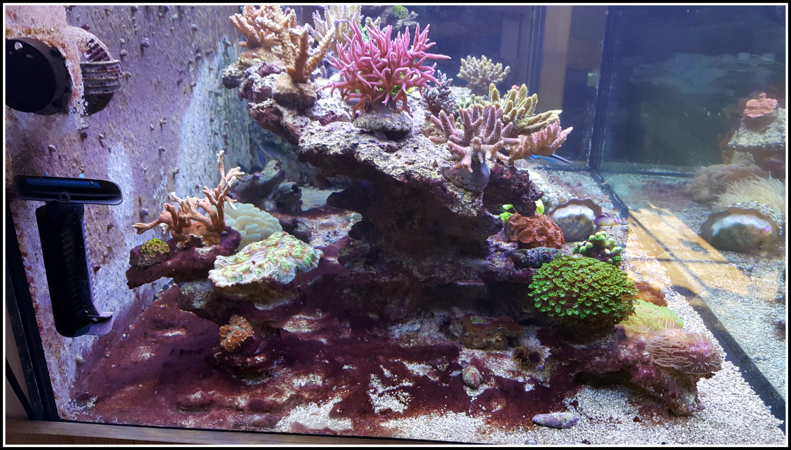 Hier mal ein Bild, wo man es so richtig gut sieht was ich meine. Wegen der Cyanos mache ich mir auch eigentlich nicht so richtig sorgen nur wegen der Kalkrotalgen halt. Das das hier Jammern auf hohem Niveau ist, ist mir schon klar.