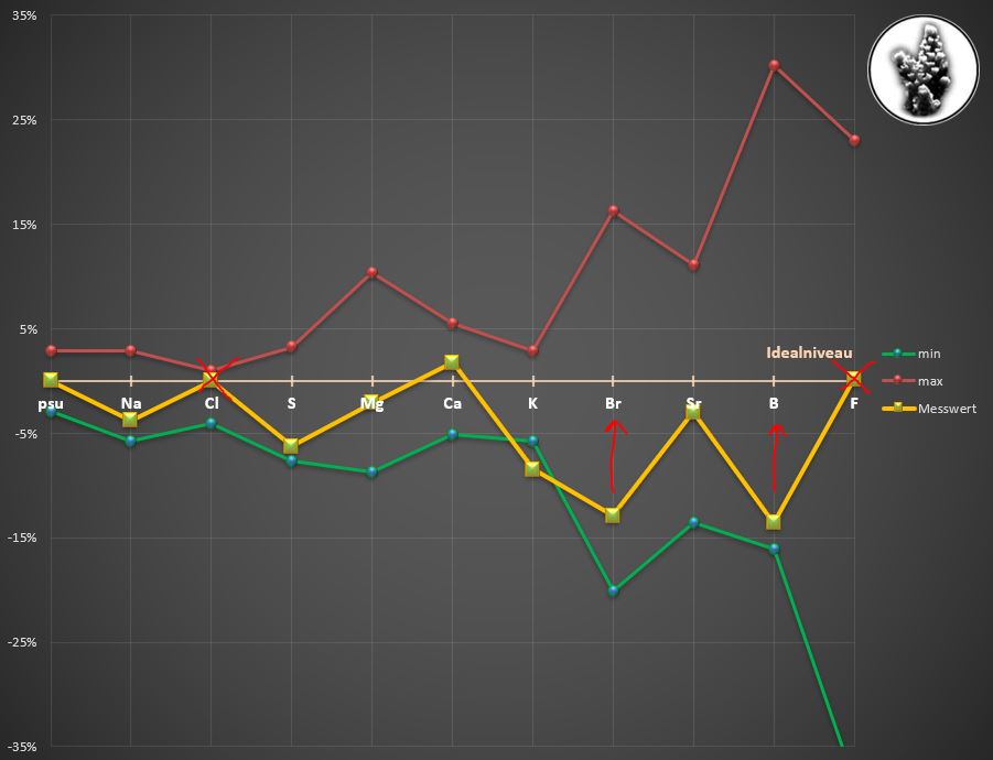 In der Bestimmung der Salinität liegt meistens der initiale Fehler; wie gesagt macht es wenig Sinn ohne diesen Parameter an den Hauptelementkonzentrationen etwas zu ändern. Zwischen der Salinität und den Elementkonzentrationen besteht eine feste Linearität.