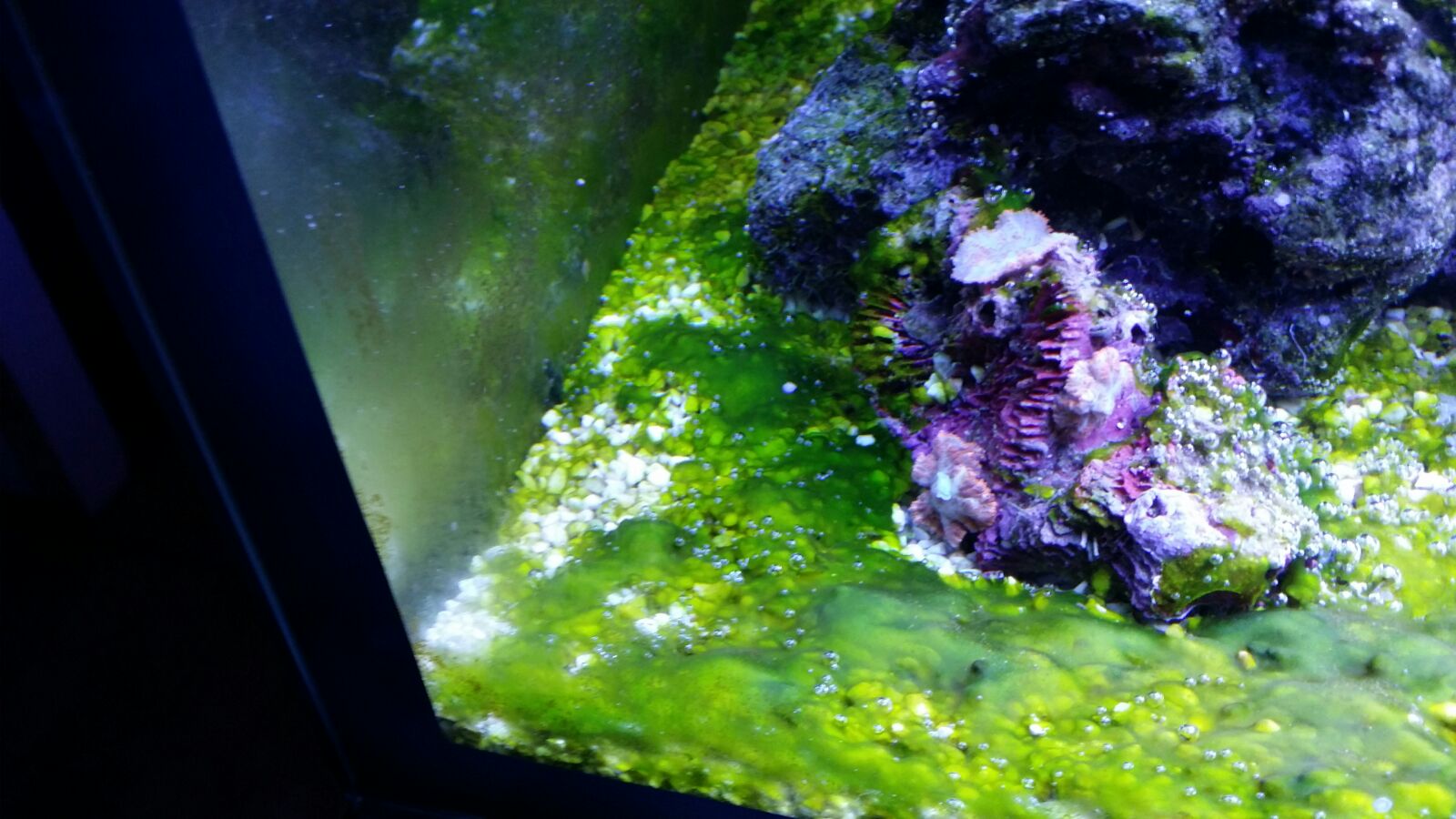 2. Die Grünen Algen wurden mehr, sie wurden eine dicke grüne Schicht und bedrängten die Korallen am Boden, ich entschloss mich den Sand etwas abzutragen um die Algen zu entfernen, inzwischen wachsen sie alle paar Tage nach und ich rühre den Sand um, damit sie nicht mehr so wuchern können.