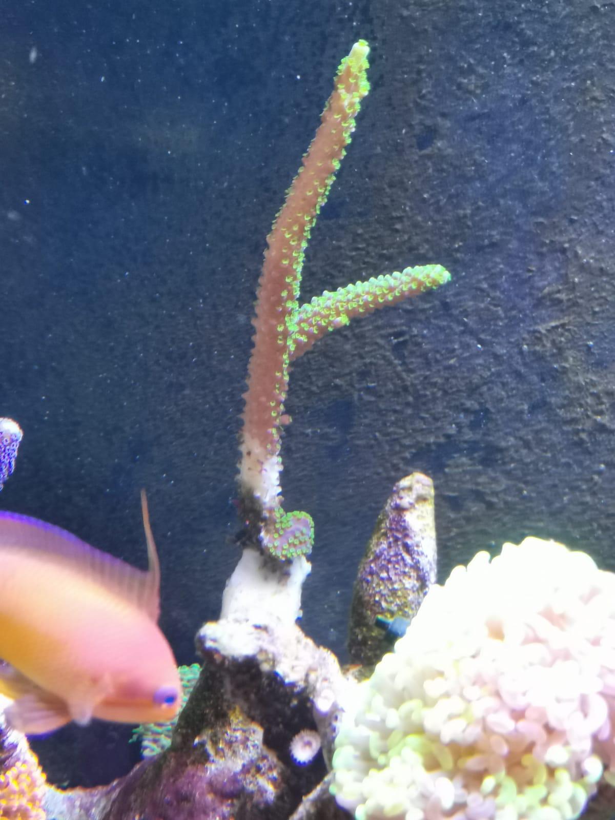 Ich hatte vor ca 1 Monat nach Rücksprache mit Jörg meine hybrid Lampe verändert. Hier habe ich die LED starke von 90 auf 50 Prozent runter. Da mir die weichkorallen und lps eingegangen sind. Das hat gut geholfen. Bei allen sps ist das Polypenbild auch richtig ausgeprägt.