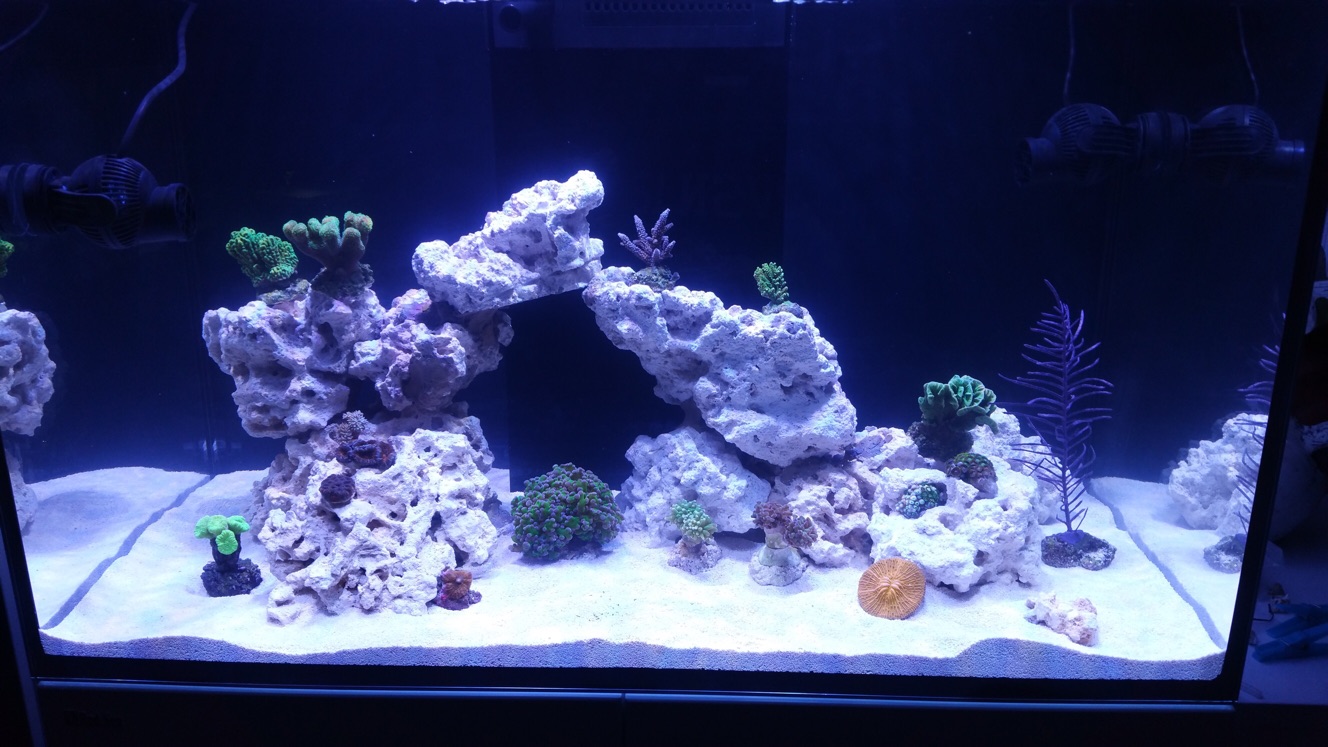 heute habe ich die am Samstag gekauften Korallen vom Boden auf den Aufbau versetzt, anbei eine aktuelle Gesamtansicht...