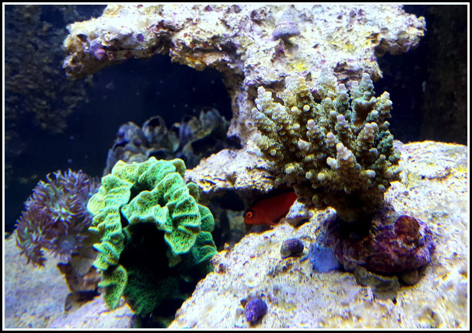 Es ist einiges an Fischen dazu gekommen was dem Becken anscheinend sehr gut tut. Korallen sind auch noch einige ins Becken gekommen und der KH Verbrauch ist auf 0,3 Grad täglich gestiegen.