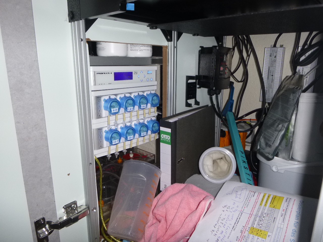 Der Vorbesitzer ersetzte die "Haustechnik" durch Royal Exklusiv Teile. Also Abschäumer und Rückförderpumpe. Aus genannter Hitzeangst ersetzte ich die T5 Beleuchtung durch 2 GHL Mitras 7206. Außerdem baute ich den Unterschrank so um, dass ich linksseitig zusätzlichen Raum habe. Darin sind GHL Profilux 4 und 2 Dosierpumpen und die zugehörigen Behälter. Dosiert werden soll mit denen Sangokai Balance und Basis.