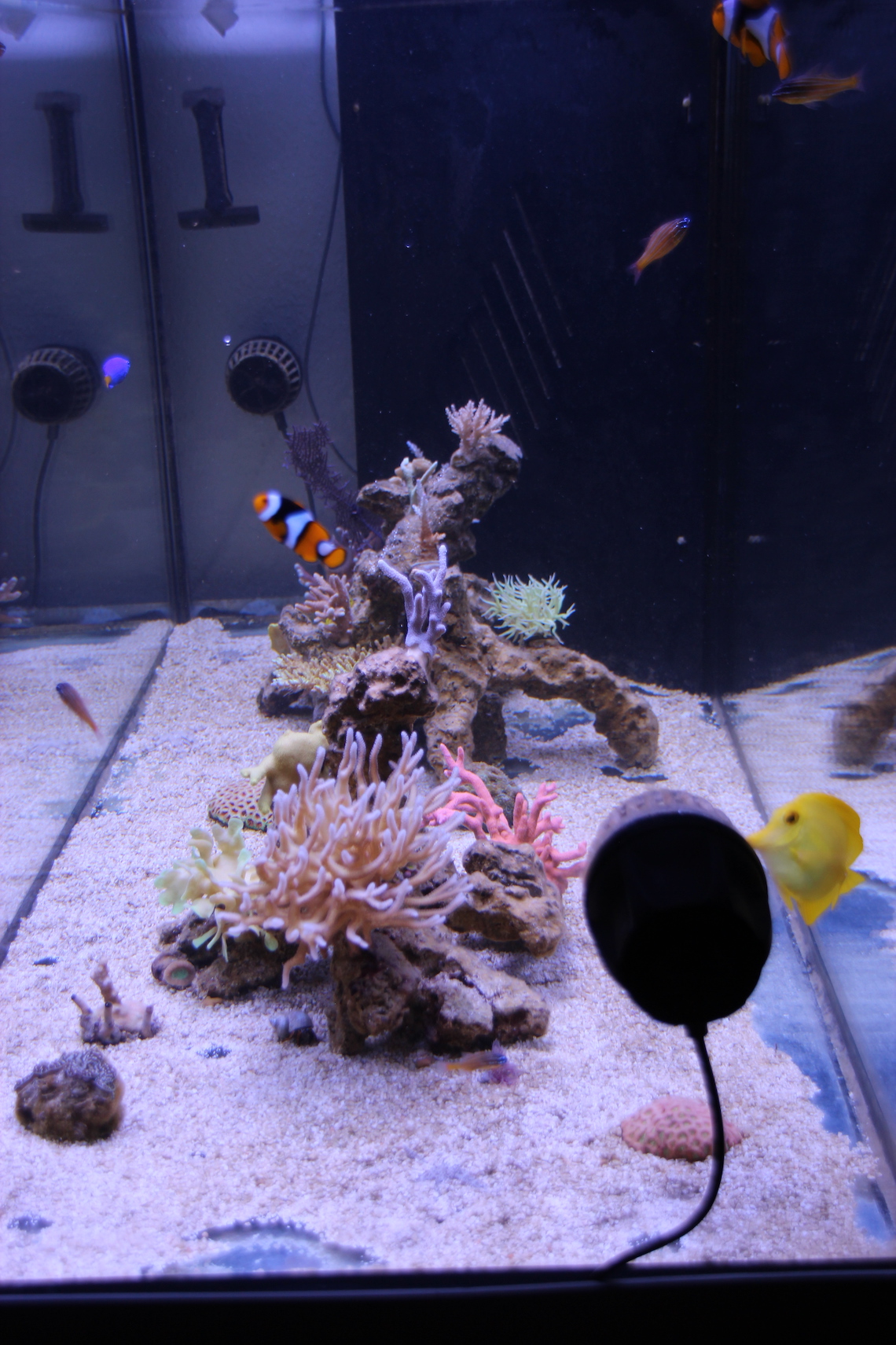 Mittlerweile sind vier überlebende Fische im neuen Becken eingezogen die sich sichtlich wohl fühlen. Nur die Korallen wollen noch nicht wirklich. Vielleicht brauchen Sie einfach ein paar Tage um sich an das Licht zu gewöhnen.