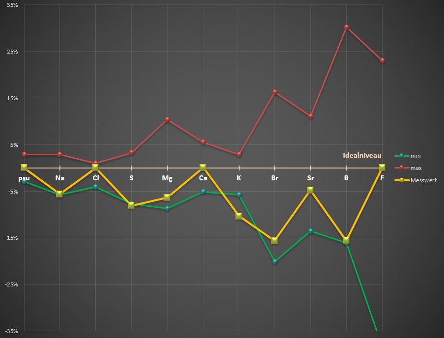 Du bist Dir sicher mit deiner Salinität von 35? Die Werte in der ICP Analyse deuten eher auf eine niedrigere Salinität hin. Nimmt man die 35 psu an, so sind die Hauptelementkonzentrationen (gelbe Linie) fast alle unter dem Idealniveau. Wie misst Du die Salinität?