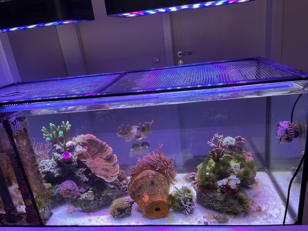 Mit dem Aussehen der Korallen, dem reduzierten Bewuchs an den Scheiben und dem Rückgang der Fadenalgen bin ich aus meinem Blickwinkel als Anfänger sehr zufrieden, sodass ich momentan keinen Anlass für überstürzte Maßnahmen sehe.