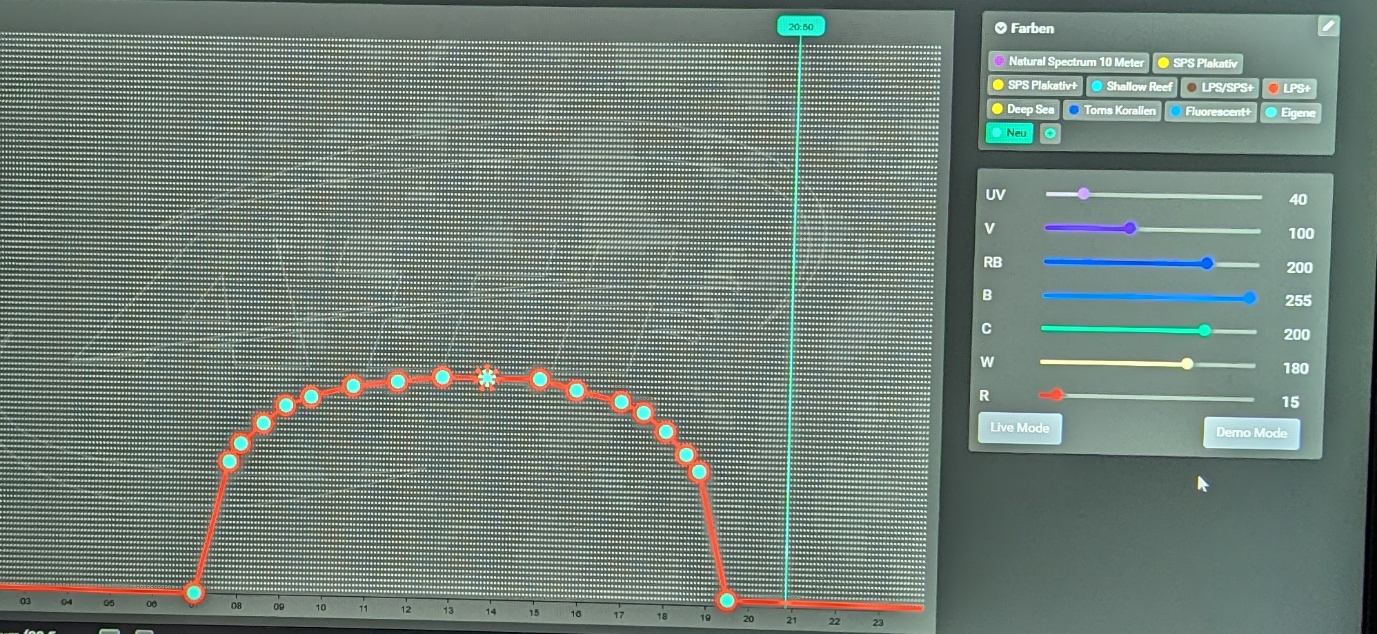 Hey, ich habe mir mit der „alten“ shallow Reef Einstellung ein paar Korallen zerschossen…die Lampe macht im UV und V gut Dampf. Spätestens wenn du die Intensität höher setzt, dürfte es spannend werden!