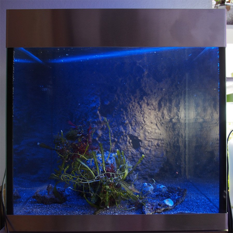 Der Würfel läuft seit Montag, dienstag habe ich den frischen Bodengrund, ein paar lebende Steine und Algen aus meinem vorhandenen Kaltwasserbecken, das dann dorthinein umziehen wird, eingebracht.